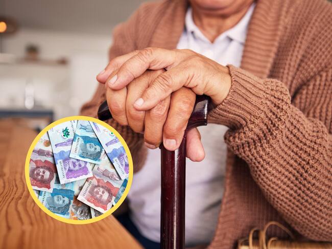 Adulto mayor con bastón junto a dinero colombiano (GettyImages)