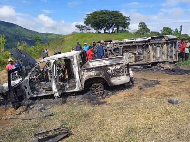 Vehículos incinerados en Buenos Aires, Cauca. Foto: Suministrada