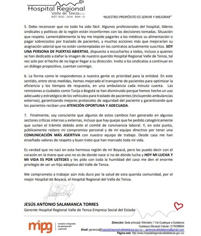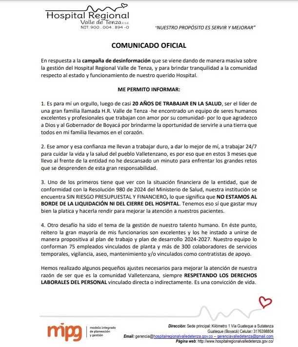 Comunicado de prensa del gerente del Hospital Regional Valle de Tenza, Jesús Antonio Salamanca Torres.