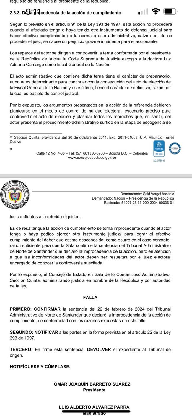 Finalmente, el Consejo de Estado determinó que: “la acción de cumplimiento se torna improcedente cuando el actor tenga o haya podido ejercer otro instrumento judicial para lograr el efectivo cumplimiento del deber que estima desconocido, como ocurre en el caso concreto, razón suficiente para que la Sala confirme la sentencia del Tribunal Administrativo de Norte de Santander que declaró la improcedencia de la acción, pero en atención a que las inconformidades del actor deben resolverse por el juez electoral encargado de conocer la controversia suscitada”, señaló el alto tribunal.