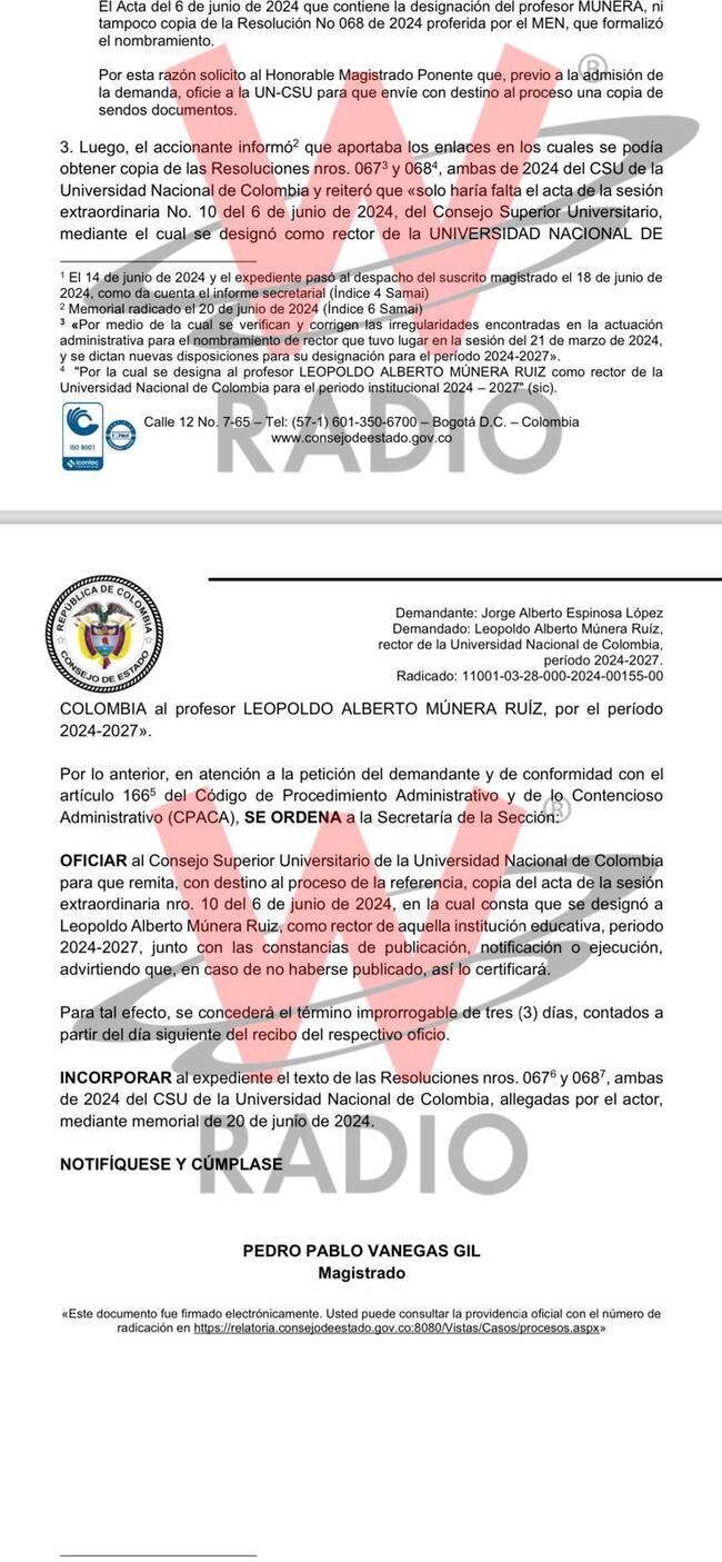 El Consejo de Estado le ordenó al Consejo Superior Universitario de la Universidad Nacional que remita el acta que ratificó el nombramiento de Leopoldo Múnera como rector.