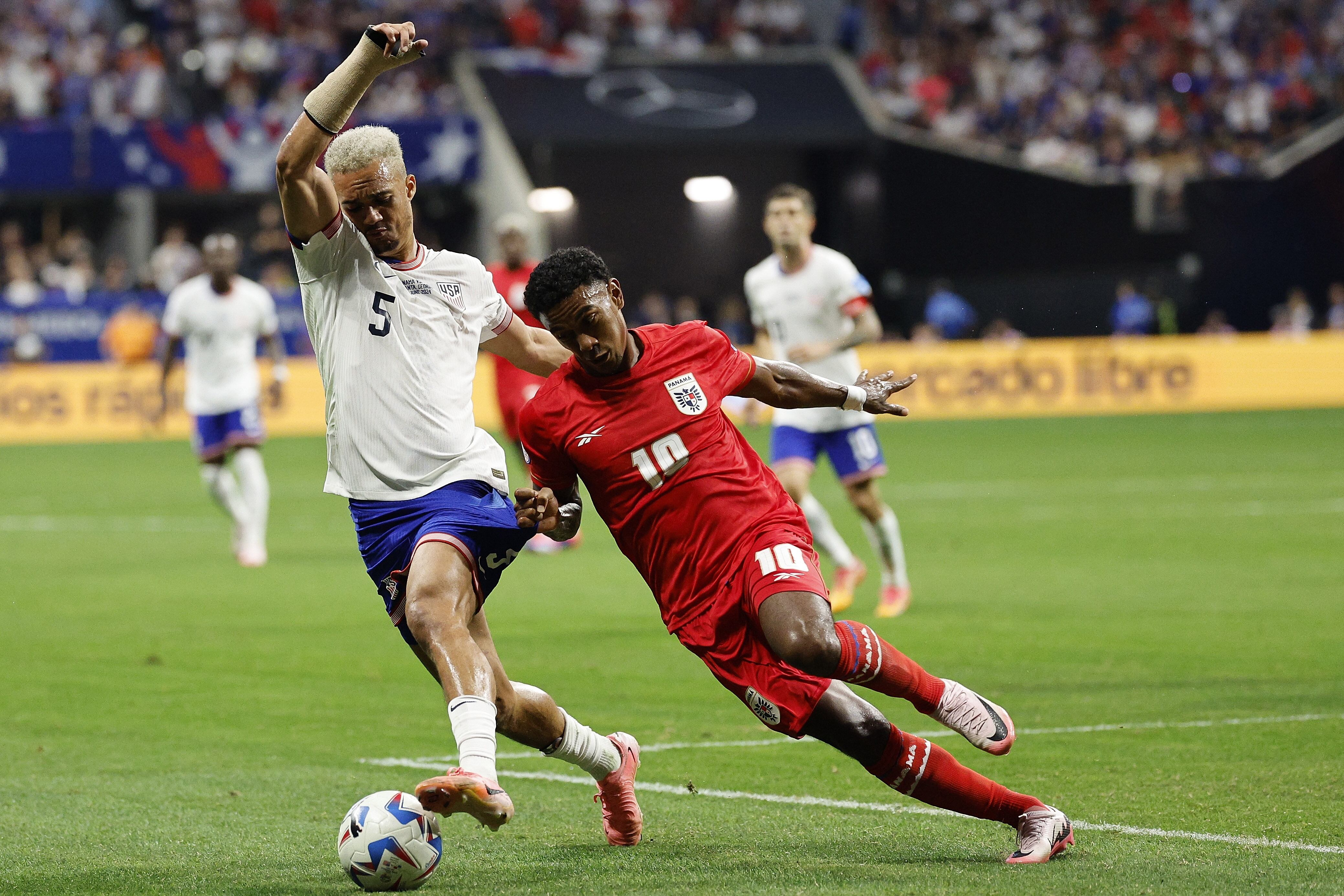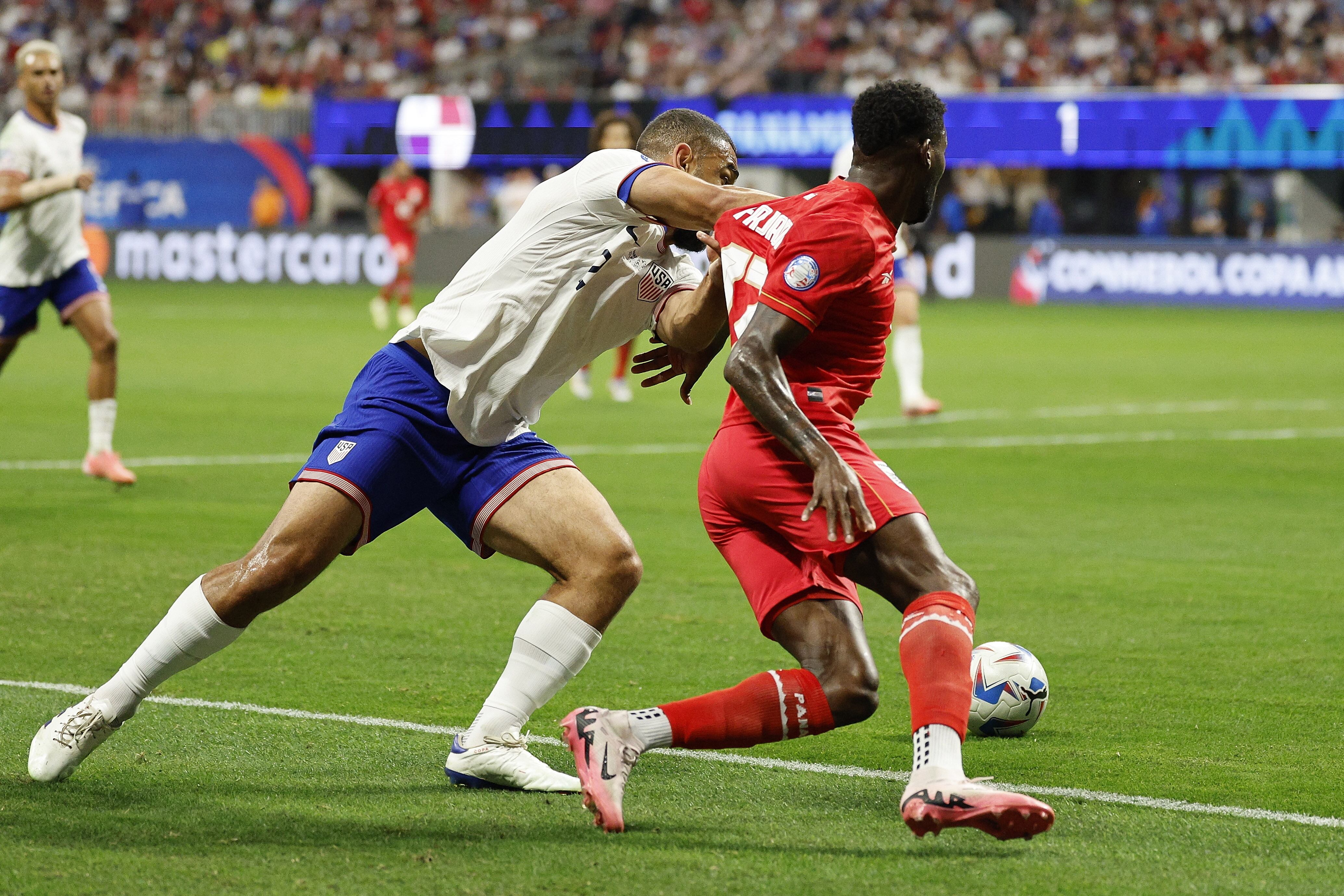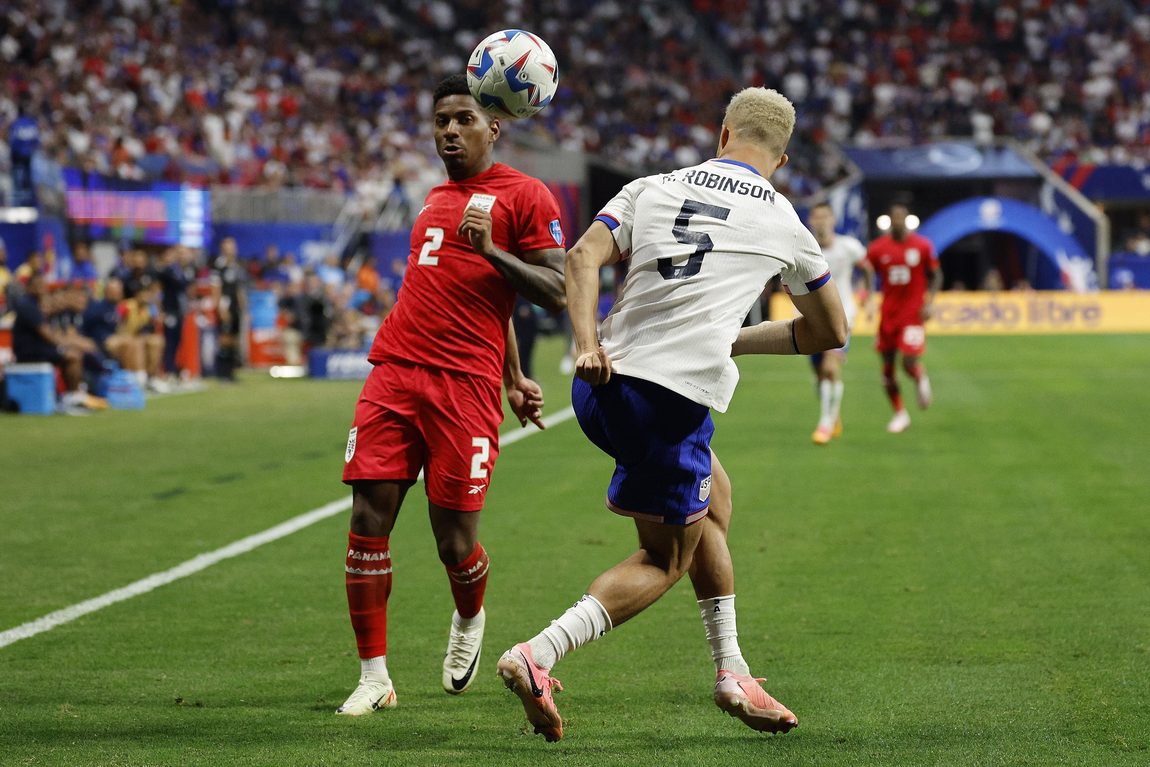 Atlanta (United States), 27/06/2024.- Cameron Carter-Vickers of the United States (L) and Jose Fajardo of Panama (R) battle for the ball during the first half of the CONMEBOL Copa America 2024 group C match between Panama and USA, in Atlanta, Georgia, USA, 27 June 2024. (Estados Unidos) EFE/EPA/ERIK S. LESSER / ERIK S. LESSER