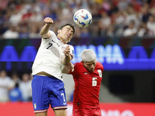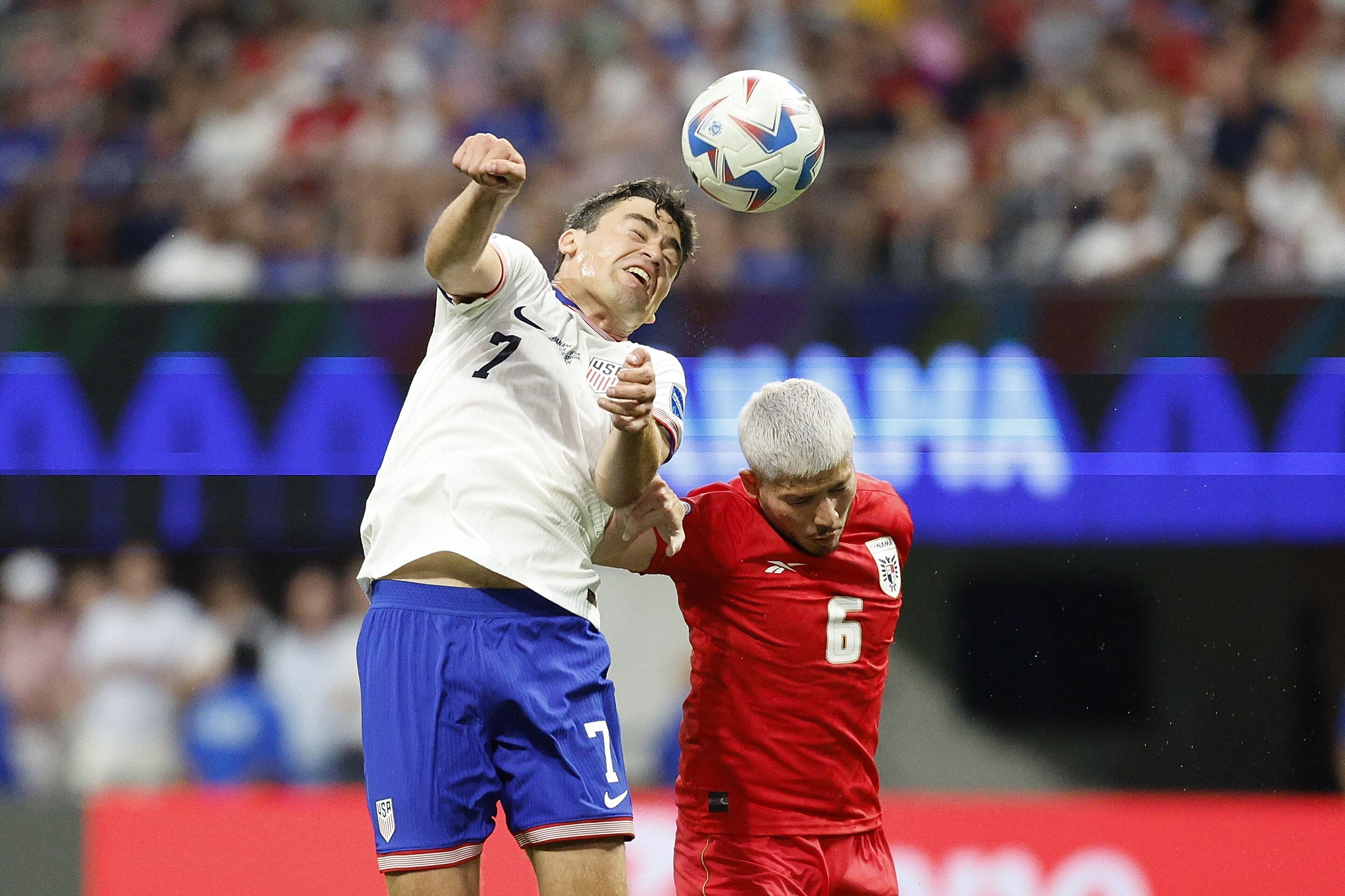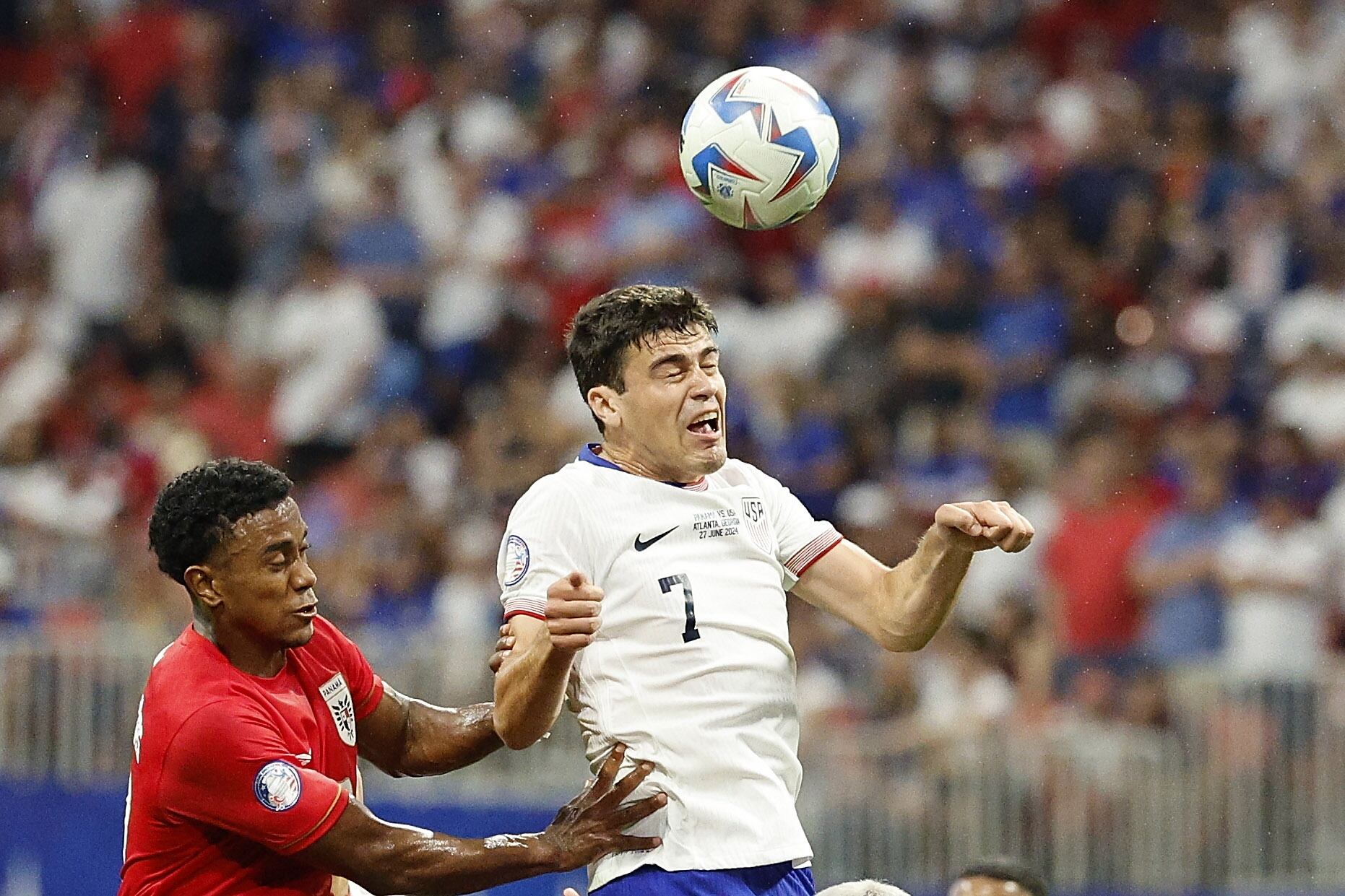 Atlanta (United States), 27/06/2024.- Giovanni Reyna of the United States (L) and Cristian Martinez of Panama (R) challenge for the ball during the first half of the CONMEBOL Copa America 2024 group C match between Panama and USA, in Atlanta, Georgia, USA, 27 June 2024. (Estados Unidos) EFE/EPA/ERIK S. LESSER / ERIK S. LESSER