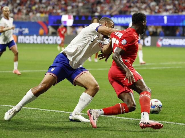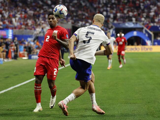 Atlanta (United States), 27/06/2024.- Antonee Robinson of the United States (R) and Cesar Blackman of Panama (L) battle for the ball during the first half of the CONMEBOL Copa America 2024 group C match between Panama and USA, in Atlanta, Georgia, USA, 27 June 2024. (Estados Unidos) EFE/EPA/ERIK S. LESSER / ERIK S. LESSER