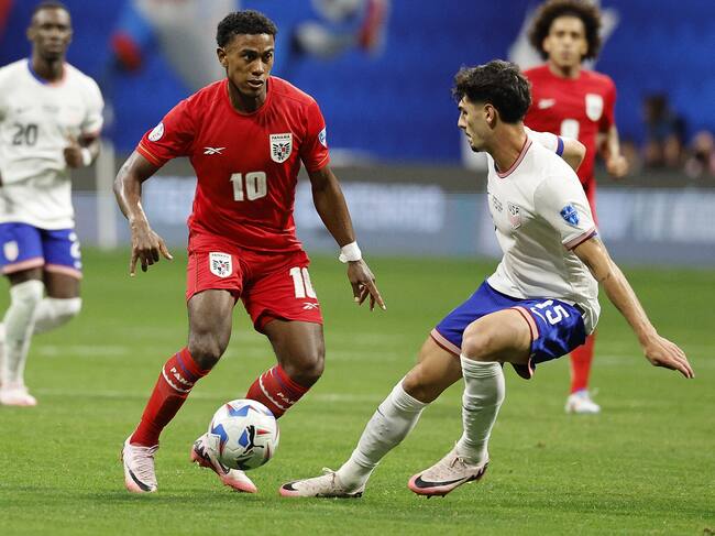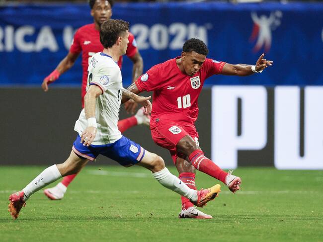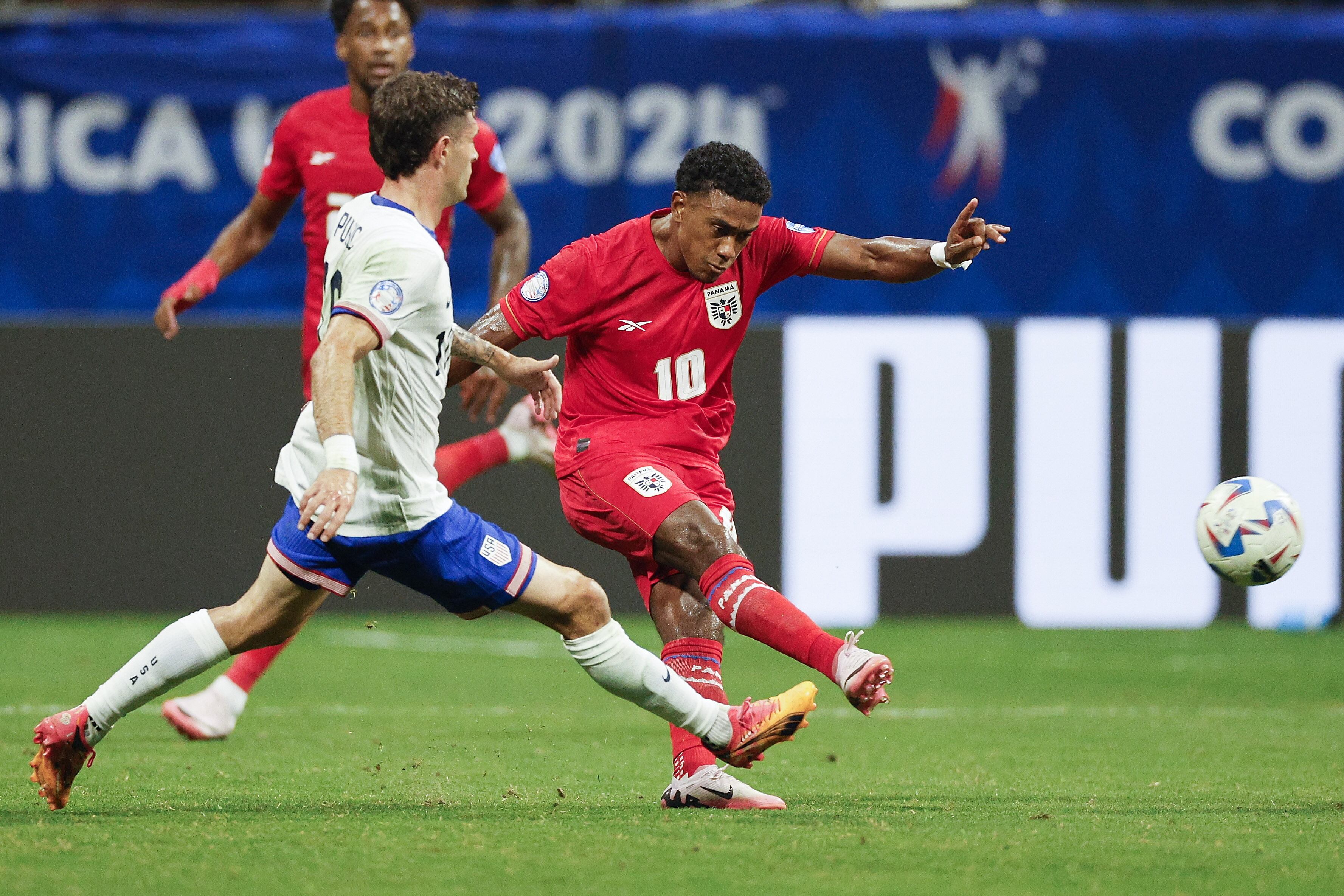 Atlanta (United States), 27/06/2024.- Christian Pulisic of the United States (L) and Yoel Barcenas of Panama (R) battle for the ball during the second half of the CONMEBOL Copa America 2024 group C match between Panama and USA, in Atlanta, Georgia, USA, 27 June 2024. (Estados Unidos) EFE/EPA/ERIK S. LESSER / ERIK S. LESSER
