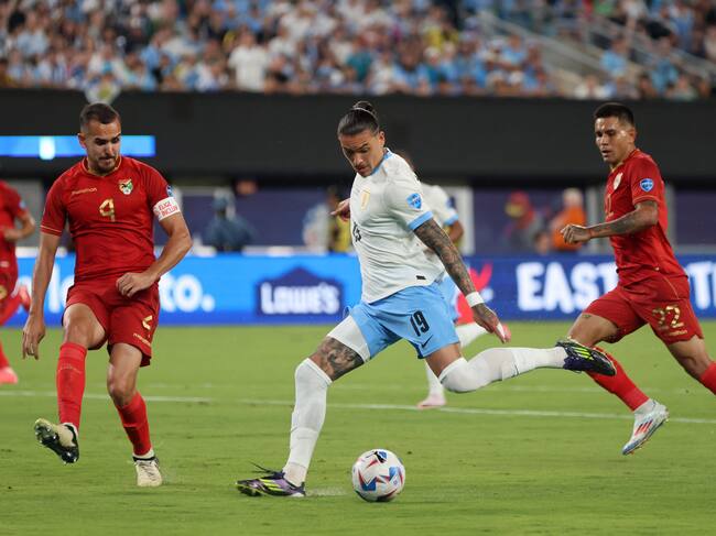 East Rutherford (United States), 28/06/2024.- Uruguay forward Darwin Nunez (C) shoots to score past Bolivia defender Luis Haquin (L) and midfielder Hector Cuellar during the first half of a CONMEBOL Copa America 2024 group C match between Uruguay and Bolivia, in East Rutherford, New Jersey, USA, 27 June 2024. EFE/EPA/JUSTIN LANE / JUSTIN LANE