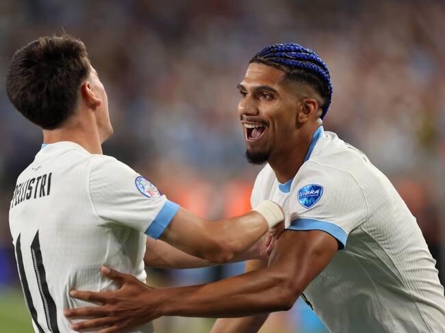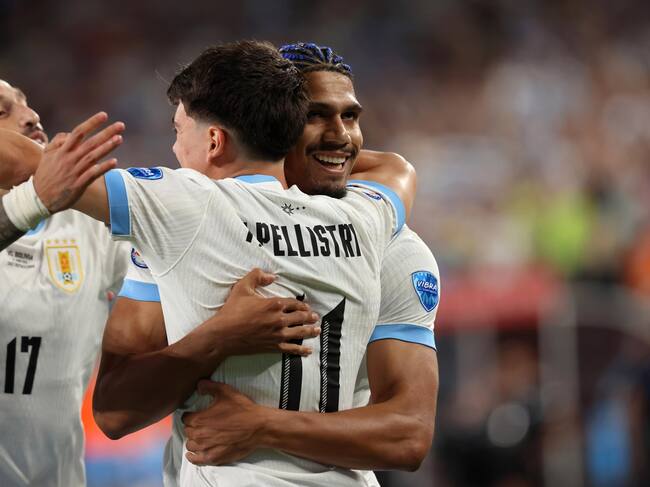 East Rutherford (United States), 28/06/2024.- Uruguay defender Ronald Araujo (R) celebrates with teammate Facundo Pellistri (C) following Pellistri's goal during the first half of a CONMEBOL Copa America 2024 group C match against Bolivia, in East Rutherford, New Jersey, USA, 27 June 2024. EFE/EPA/JUSTIN LANE / JUSTIN LANE