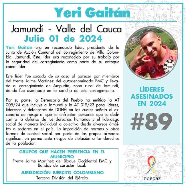 Indepaz confirmó el asesinato de Yeri Gaitán, presidente de la Junta de Acción Comunal del corregimiento de Villa Colombia, zona rural de Jamundí. La víctima era reconocida por su trabajo en pro de la seguridad de su comunidad.