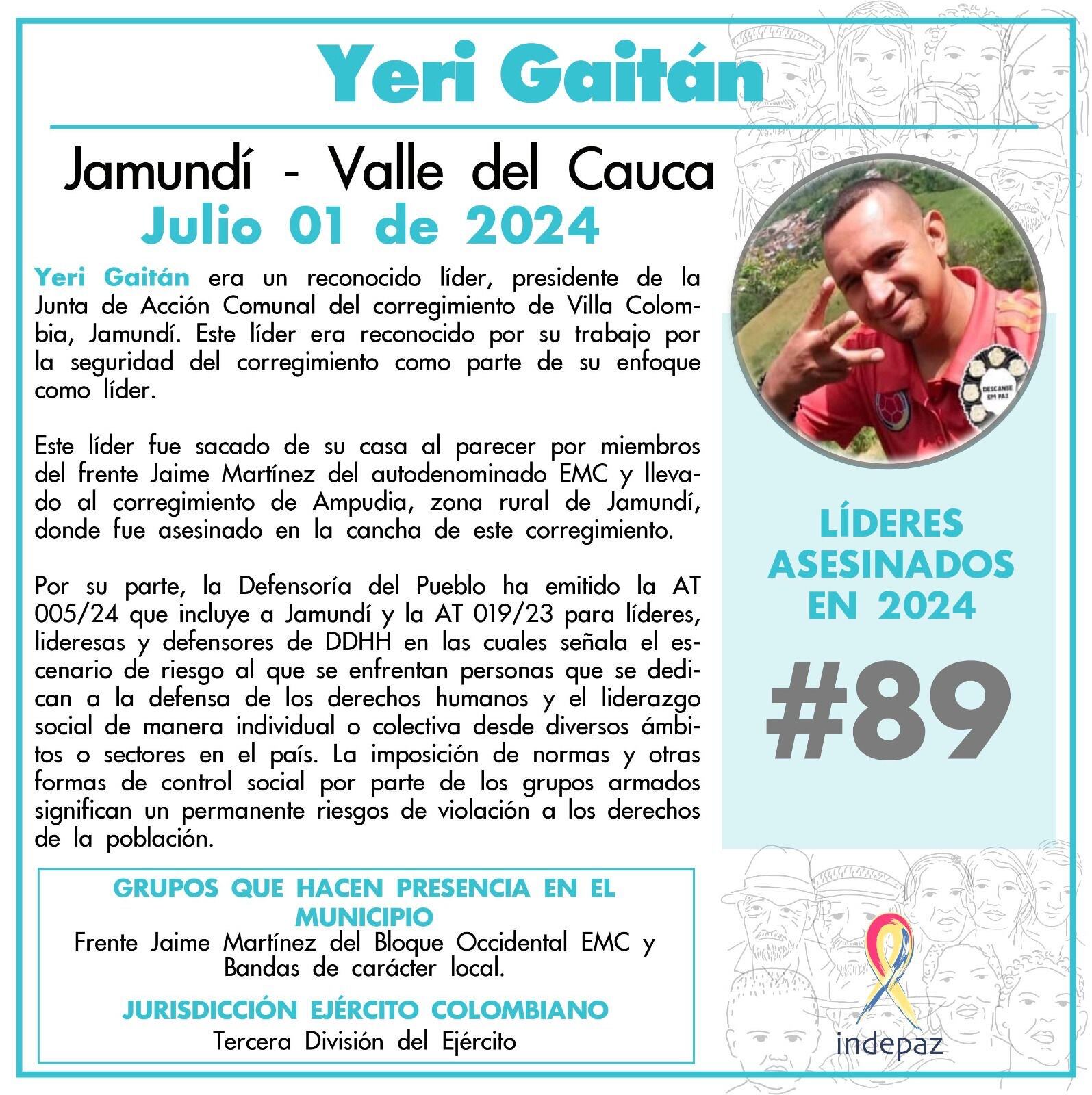 Indepaz confirmó el asesinato de Yeri Gaitán, presidente de la Junta de Acción Comunal del corregimiento de Villa Colombia, zona rural de Jamundí. La víctima era reconocida por su trabajo en pro de la seguridad de su comunidad.