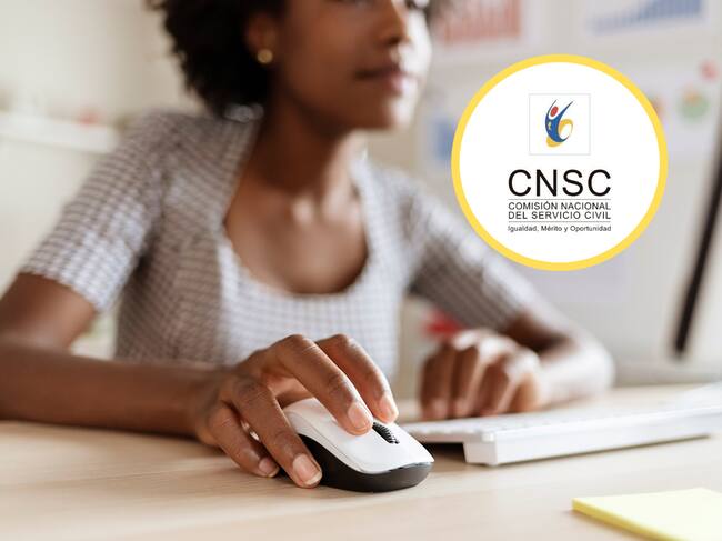 Mujer usando computador, junto al logo de la Comisión Nacional del Servicio Civil (GettyImages / Redes sociales)