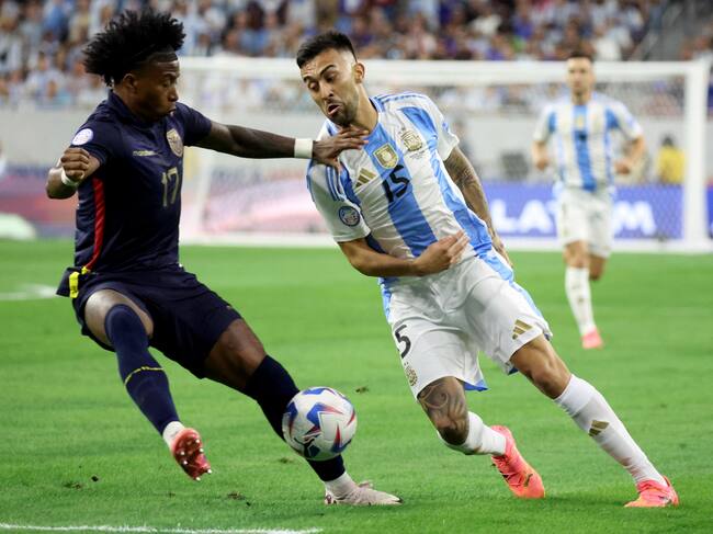Houston (United States), 05/07/2024.- Angelo Preciado (L) of Ecuador in action against Nicolás González (R) of Argentina (R) during the CONMEBOL Copa America 2024 quarterfinals soccer match between Argentina and Ecuador, in Houston, Texas, USA, 04 July 2024. EFE/EPA/LESLIE PLAZA JOHNSON / LESLIE PLAZA JOHNSON