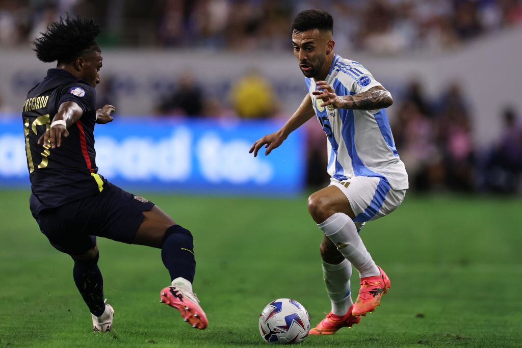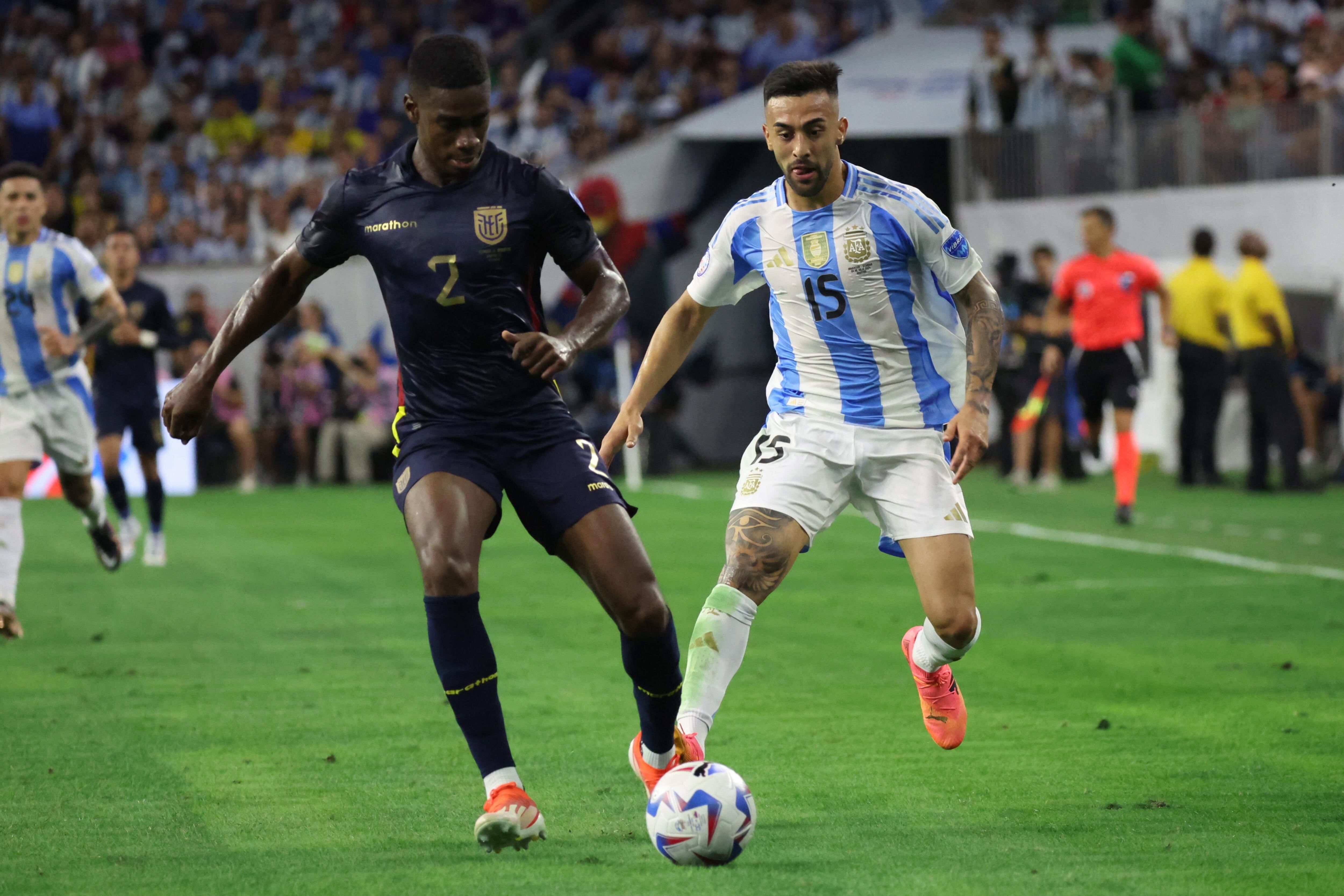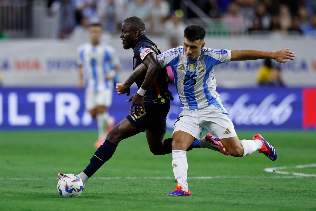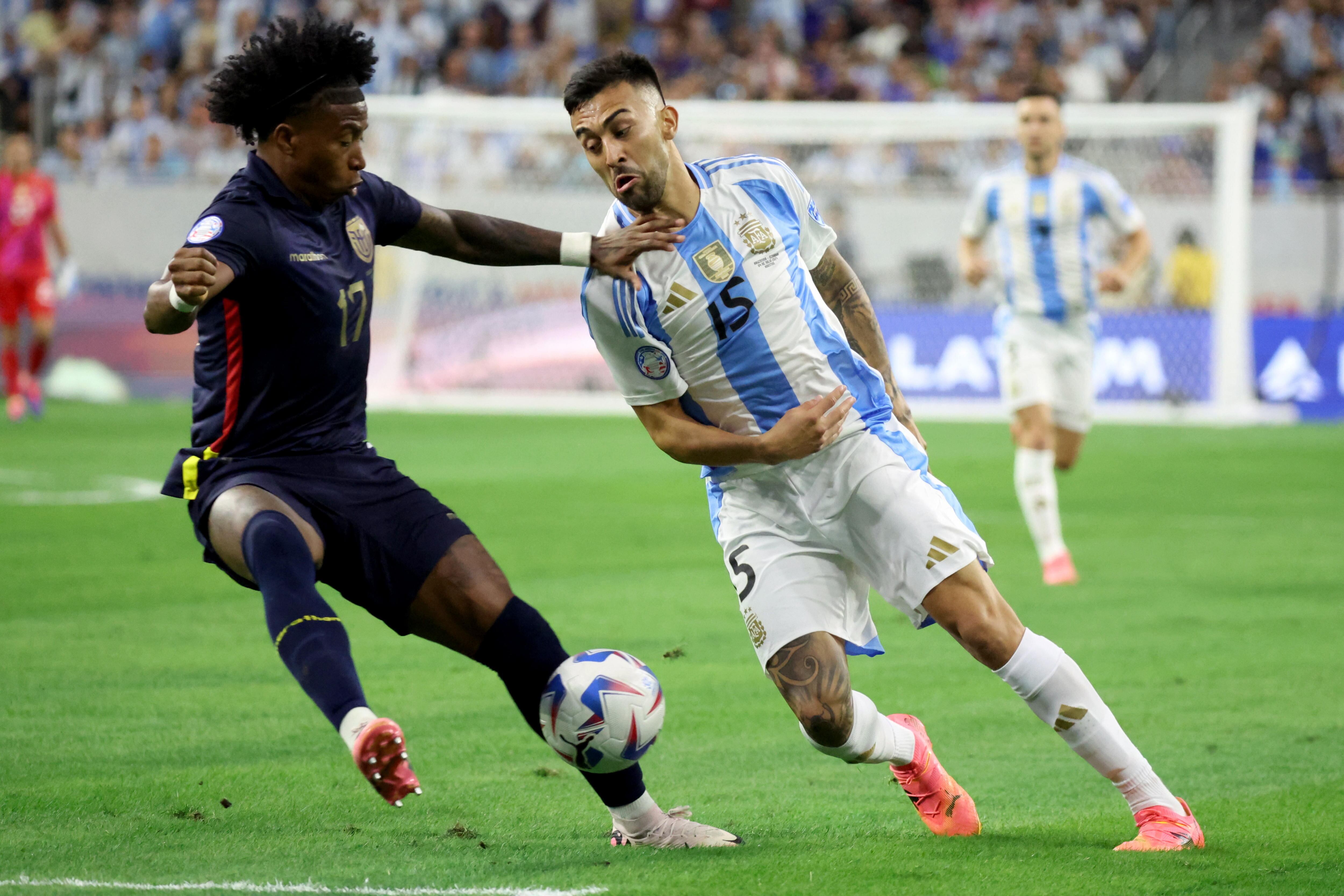 HOUSTON, TEXAS - JULY 04: Angelo Preciado of Ecuador battles for possession with Nicolas Gonzalez of Argentina during the CONMEBOL Copa America 2024 quarter-final match between Argentina and Ecuador at NRG Stadium on July 04, 2024 in Houston, Texas. (Photo by Omar Vega/Getty Images) / Omar Vega