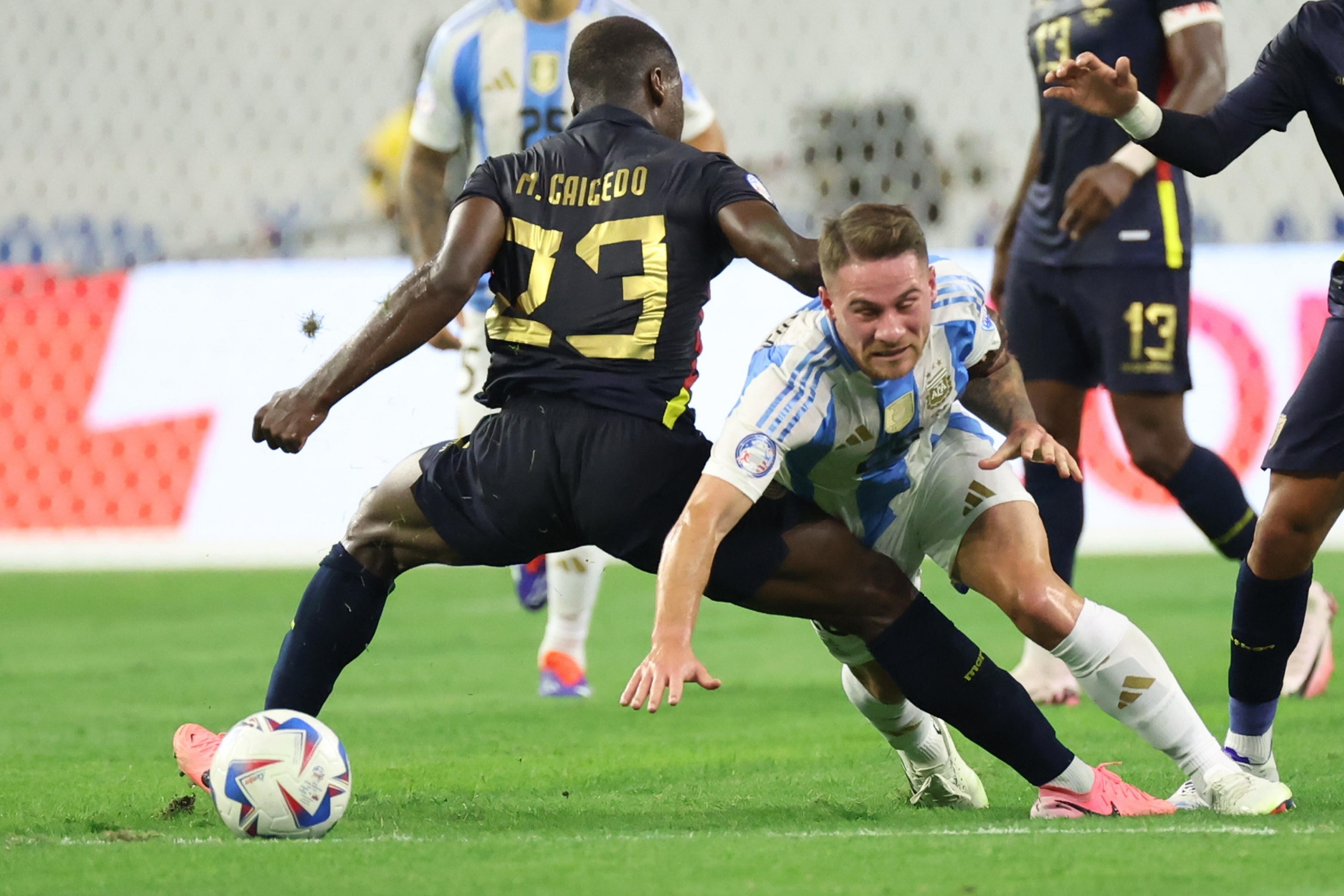 Houston (United States), 05/07/2024.- Argentina midfielder Alexis Mac Allister (R) draws a foul against Ecuador midfielder Moisés Caicedo (L) during the CONMEBOL Copa America 2024 quarterfinals soccer match between Argentina and Ecuador, in Houston, Texas, USA, 04 July 2024. EFE/EPA/LESLIE PLAZA JOHNSON / LESLIE PLAZA JOHNSON