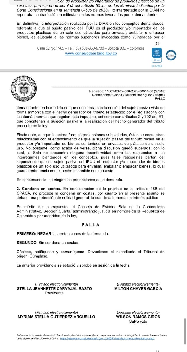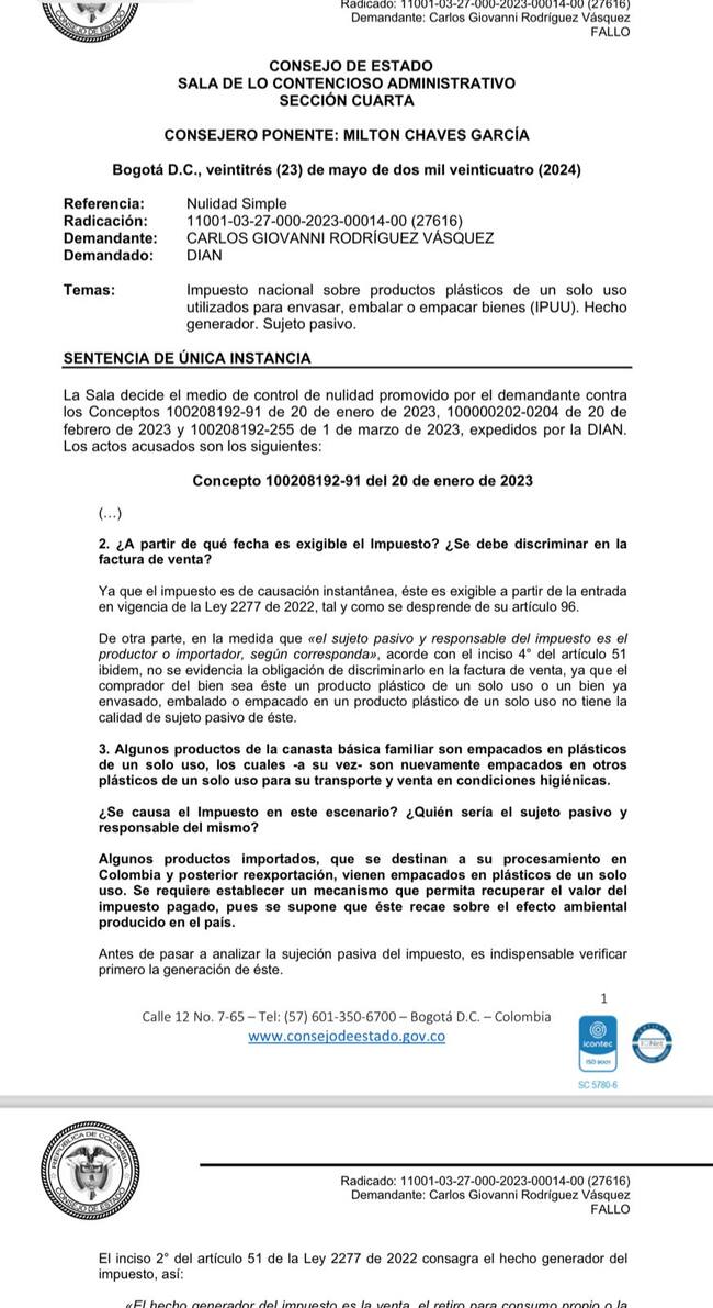 La reciente decisión la tomó el alto tribunal al estudiar una demanda en contra de los tres conceptos de la Dirección de Impuestos y Aduanas Nacionales “100208192-91 de 20 de enero de 2023, 100000202-0204 de 20 de febrero de 2023 y 100208192-255 de 1 de marzo de 2023″, allí la DIAN precisó que el sujeto pasivo del impuesto nacional sobre productos plásticos de un solo uso es el productor y/o importador de bienes plásticos de un solo uso utilizados para envasar, embalar o empacar bienes.