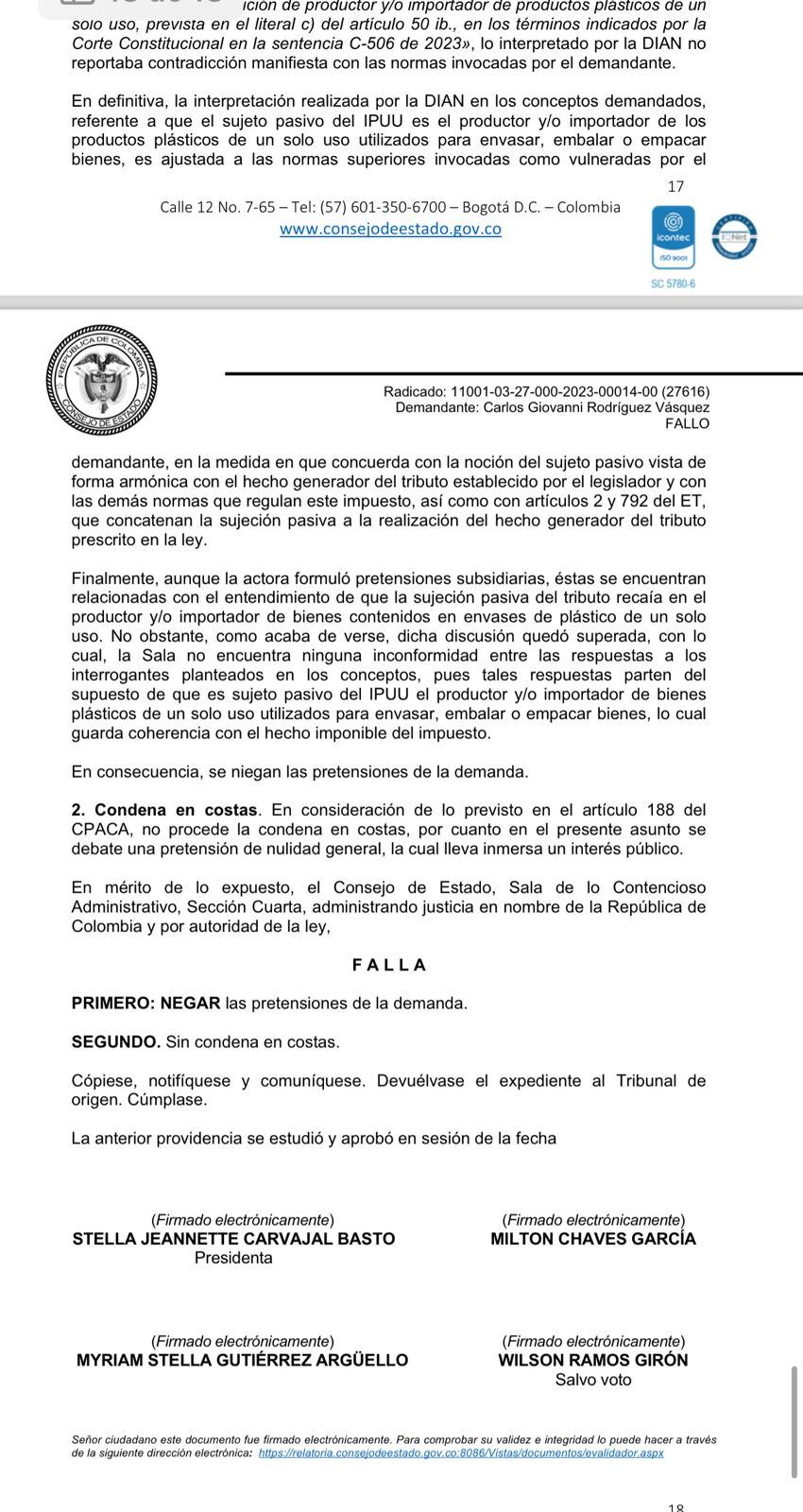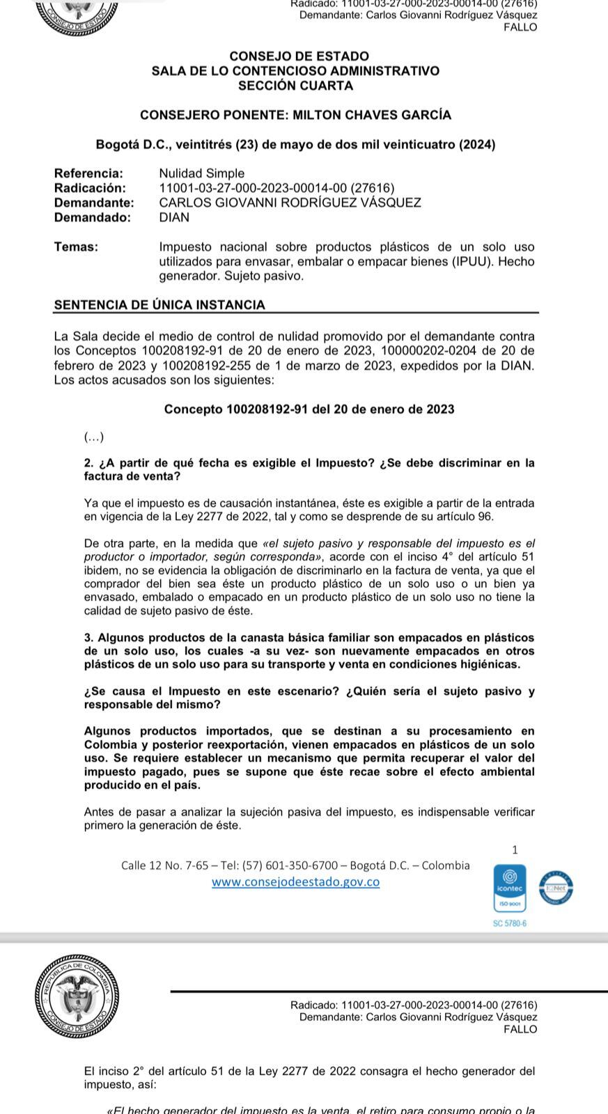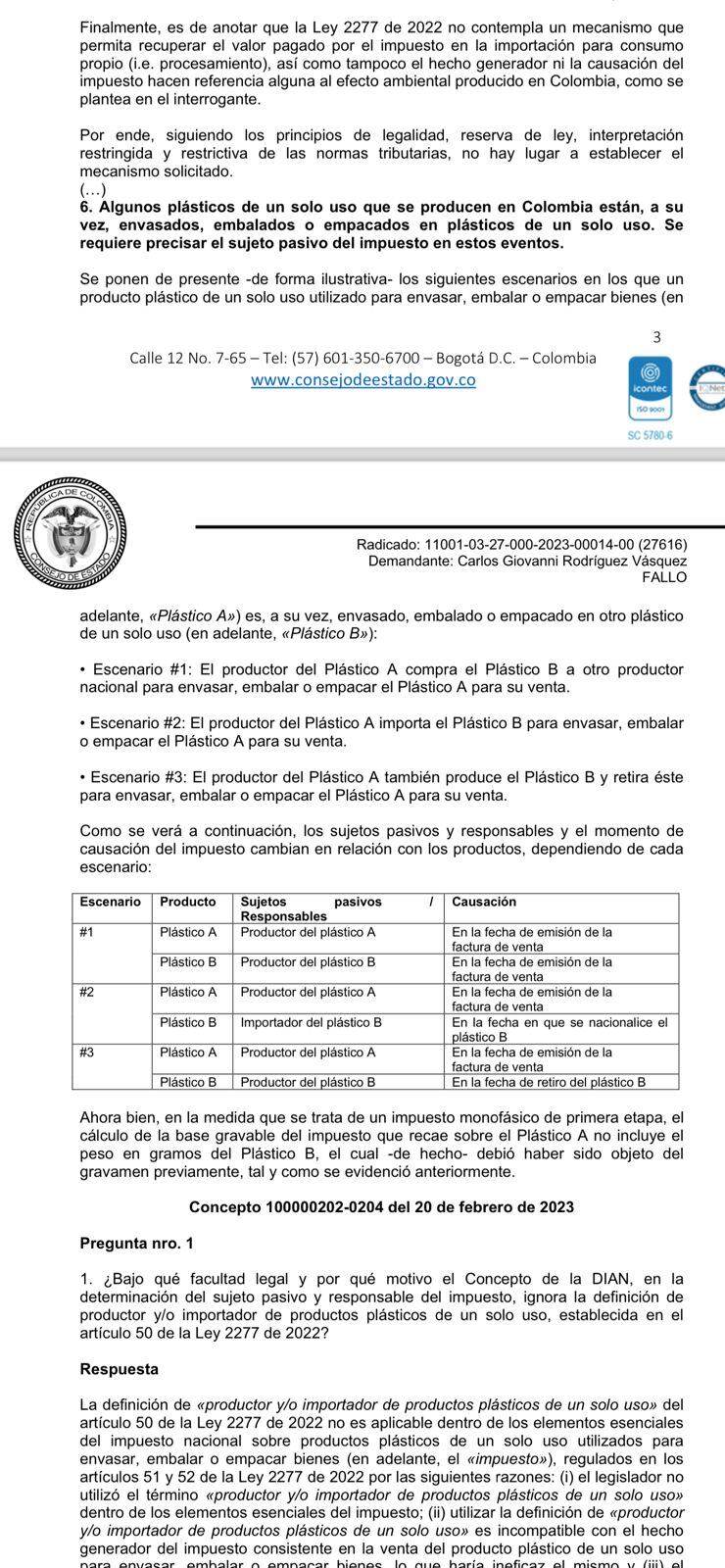 La reciente decisión la tomó el alto tribunal al estudiar una demanda en contra de los tres conceptos de la Dirección de Impuestos y Aduanas Nacionales “100208192-91 de 20 de enero de 2023, 100000202-0204 de 20 de febrero de 2023 y 100208192-255 de 1 de marzo de 2023″, allí la DIAN precisó que el sujeto pasivo del impuesto nacional sobre productos plásticos de un solo uso es el productor y/o importador de bienes plásticos de un solo uso utilizados para envasar, embalar o empacar bienes.