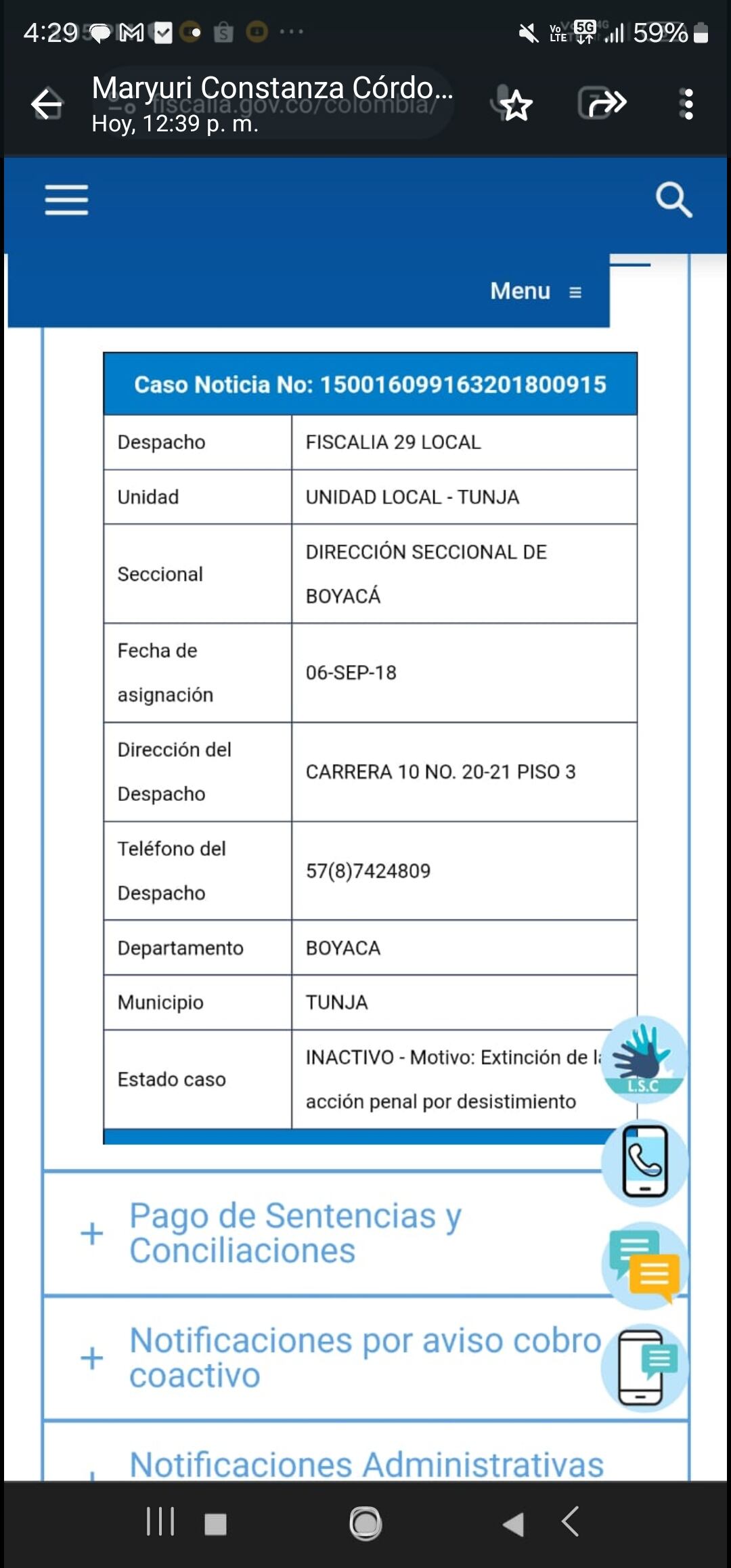 Según la denunciante y documentos en poder de Sigue La W, la denuncia fue asignada a la Fiscalía 29 local de Tunja en Boyacá, el 6 de septiembre de 2018.