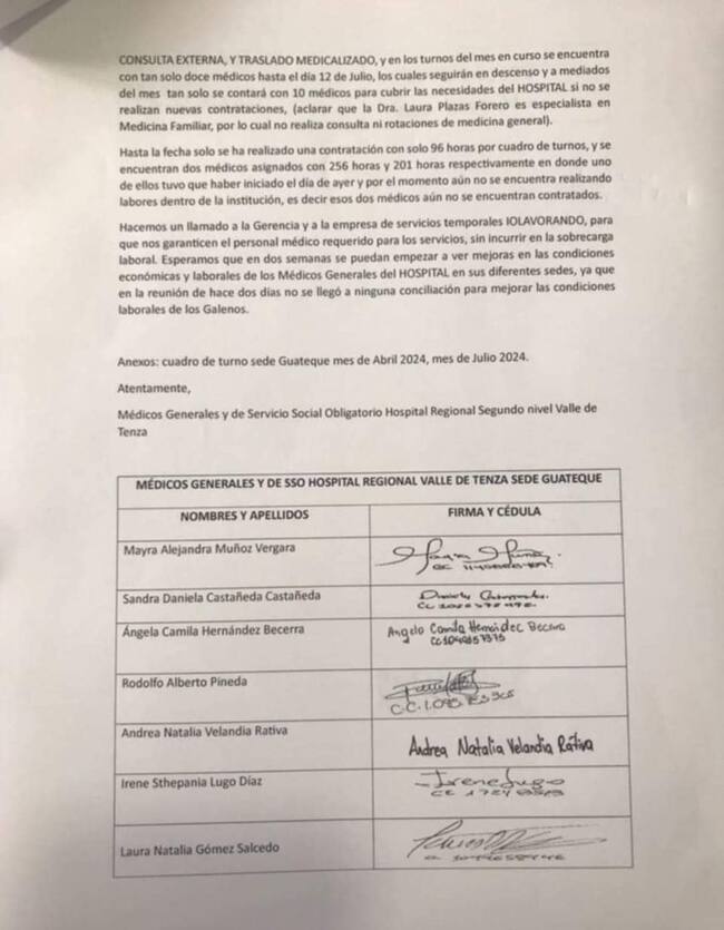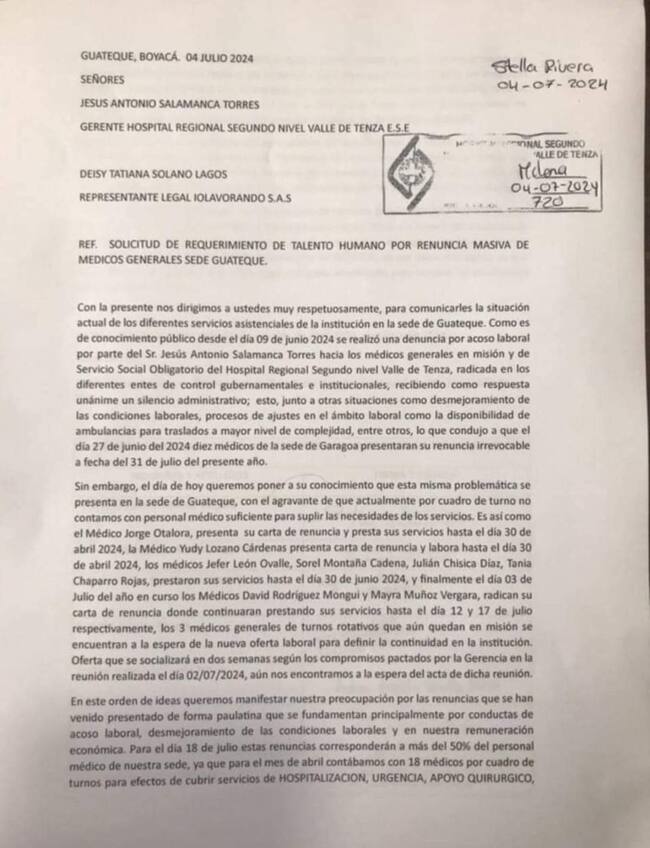 En las últimas horas, nueve médicos generales de renunciaron de manera irrevocable a su cargo en el municipio de Guateque, Boyacá, y según el comunicado emitido por parte de los galenos, un presunto acoso laboral por parte del gerente del centro asistencial, Jesús Antonio Salamanca Torres, fue el detonante para la renuncia masiva de los profesionales.