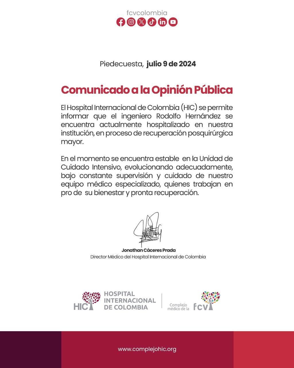 A través de un comunicado, el Hospital Internacional de Colombia informó que el excandidato presidencial Rodolfo Hernández se encuentra estable.