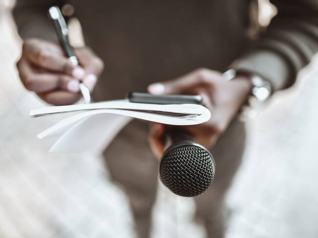 Imagen de referencia de periodista sosteniendo un micrófono y una libreta. Foto: Getty Images / AleksandarGeorgiev