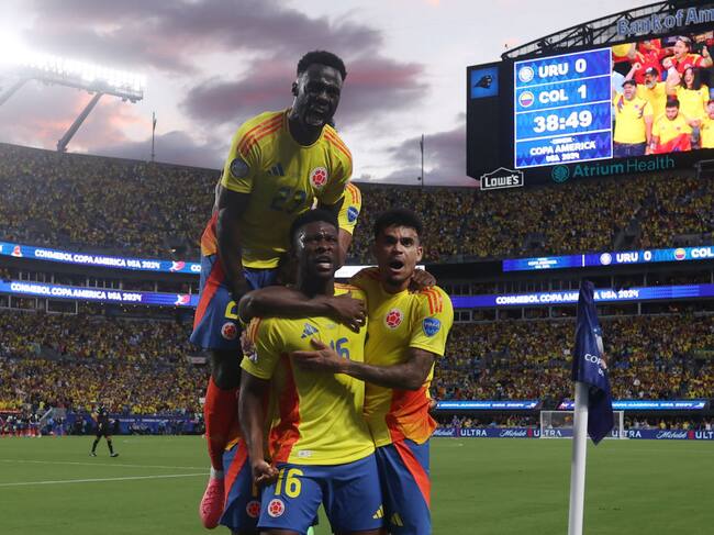 CHARLOTTE, NORTH CAROLINA - JULY 10: Jefferson Lerma of Colombia celebrates with teammates after scoring the team's first goal during the CONMEBOL Copa America 2024 semifinal match between Uruguay and Colombia at Bank of America Stadium on July 10, 2024 in Charlotte, North Carolina. (Photo by Tim Nwachukwu/Getty Images) / Tim Nwachukwu
