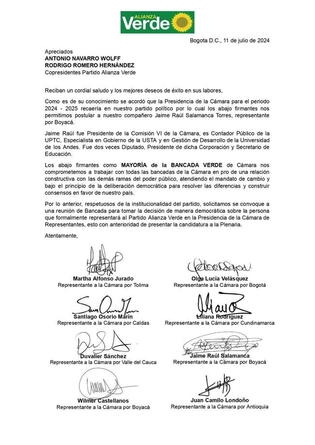 Los que respaldan a Salamanca no reconocieron la candidatura de Miranda y no aceptaron que tengan que enfrentarse a voto limpio en la plenaria. Por eso, a través de una carta hicieron la solicitud al ejecutivo del partido para que se “tome una decisión de manera democrática sobre la persona que formalmente representará al partido Alianza Verde en la Presidencia de la Cámara”.