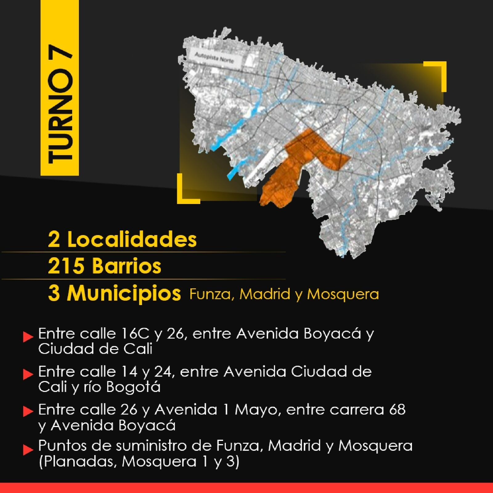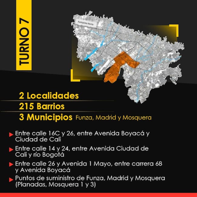 Las localidades afectadas son: Fontibón y Kennedy, en el caso de los puntos de suministros municipales, serán: Funza, Madrid y Mosquera.