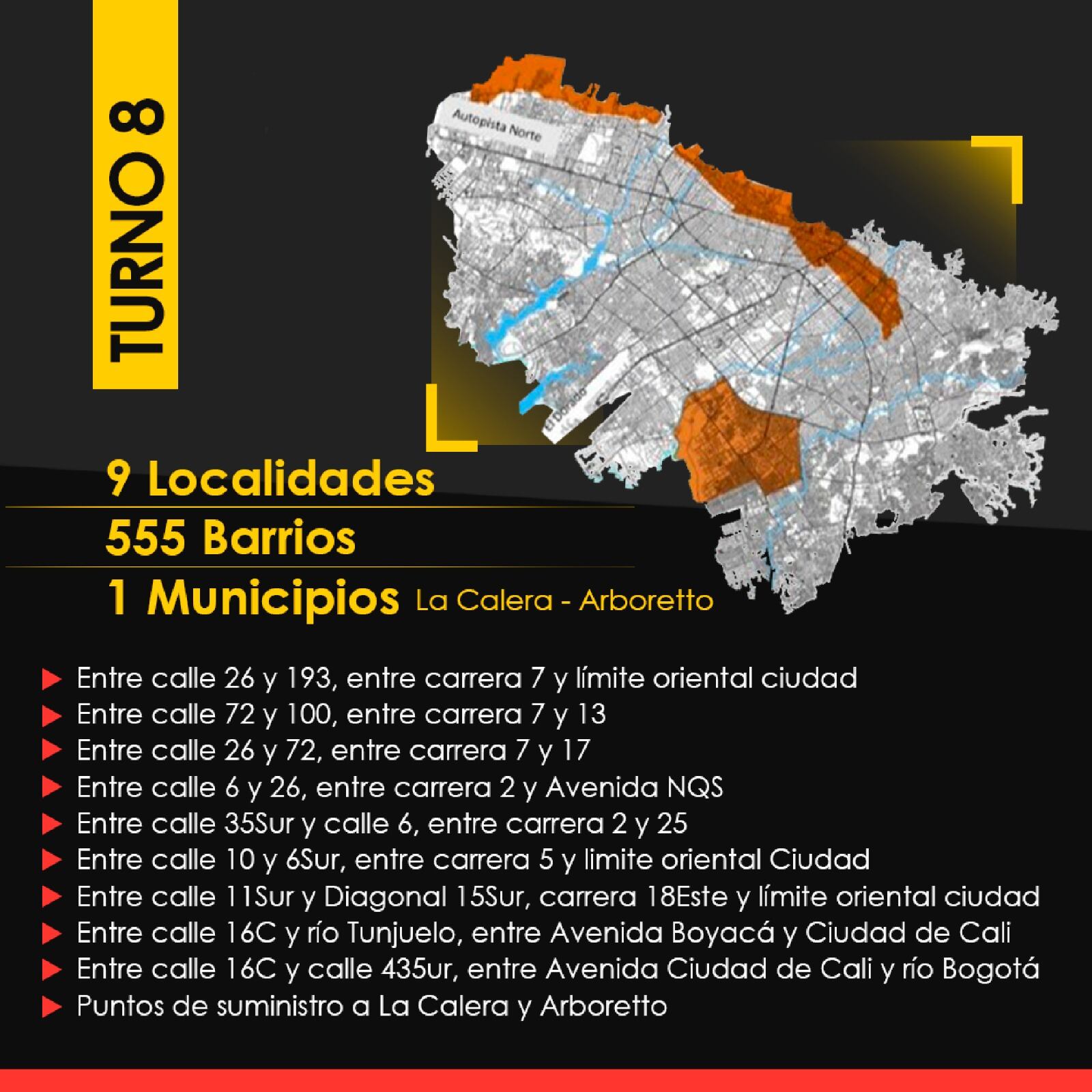 Las localidades afectadas son: Antonio Nariño, Bosa, La Candelaria, Chapinero, Kennedy, Los Mártires, Rafael Uribe Uribe, San Cristóbal, Santa Fe y Usaquén, mientras que los puntos de suministro son: La Calera y Arboretto.