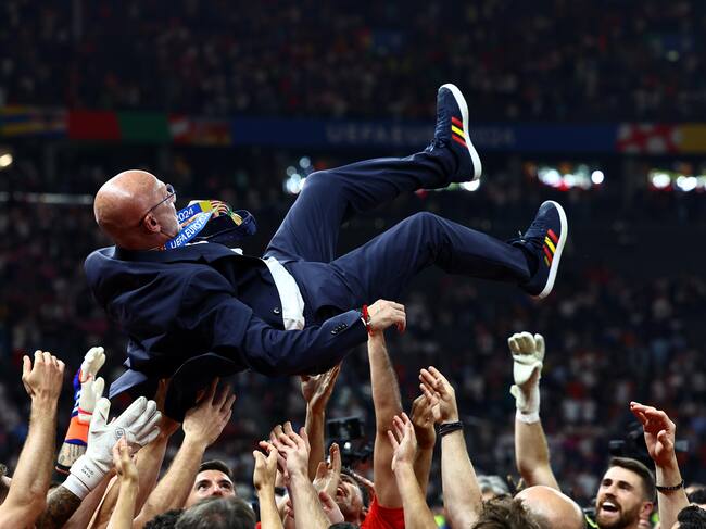 Berlin (Germany), 14/07/2024.- Head coach Luis de la Fuente of Spain is celebrated by his players after they won the UEFA EURO 2024 final soccer match between Spain and England, in Berlin, Germany, 14 July 2024. (Alemania, España) EFE/EPA/FILIP SINGER / FILIP SINGER (EFE)