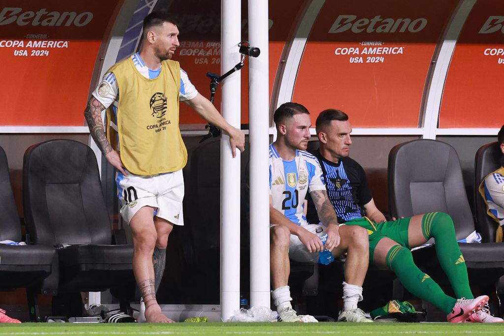 MIAMI GARDENS, FLORIDA - JULY 14: Lionel Messi of Argentina watches the actions from the bench after leaving the pitch with an injury during the CONMEBOL Copa America 2024 Final match between Argentina and Colombia at Hard Rock Stadium on July 14, 2024 in Miami Gardens, Florida. (Photo by Carmen Mandato/Getty Images) / Carmen Mandato