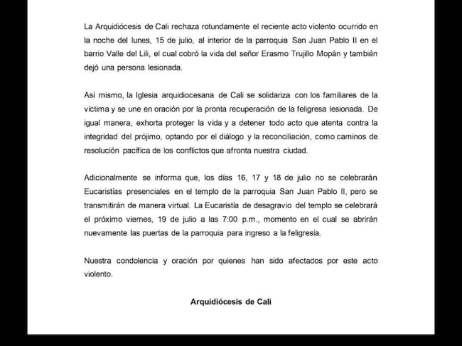 Desde la Arquidiócesis de Cali rechazaron el acto violento, se solidarizaron con la familia de la víctima e informaron que durante los próximos tres días no se celebrarán eucaristías en el templo donde ocurrieron los hechos.