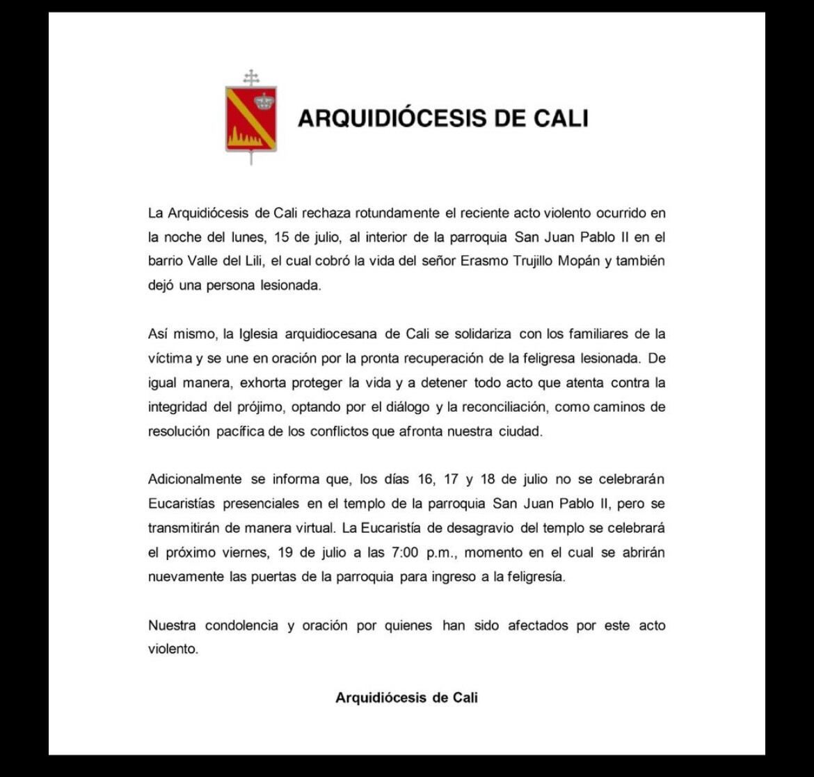 Desde la Arquidiócesis de Cali rechazaron el acto violento, se solidarizaron con la familia de la víctima e informaron que durante los próximos tres días no se celebrarán eucaristías en el templo donde ocurrieron los hechos.