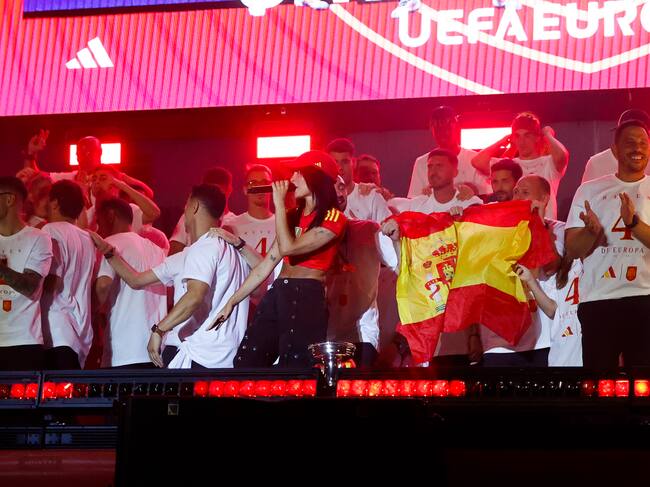 MADRID, 15/07/2024.- La cantante Aitana durante su actuación acompañada por los jugadores de la selección española este lunes en Cibeles en la celebración del título de campeones de la Eurocopa conseguido tras vencer ayer en la final a Inglaterra disputada en el estadio Olímpico de Berlín. EFE / JP Gandul. / J P GANDUL