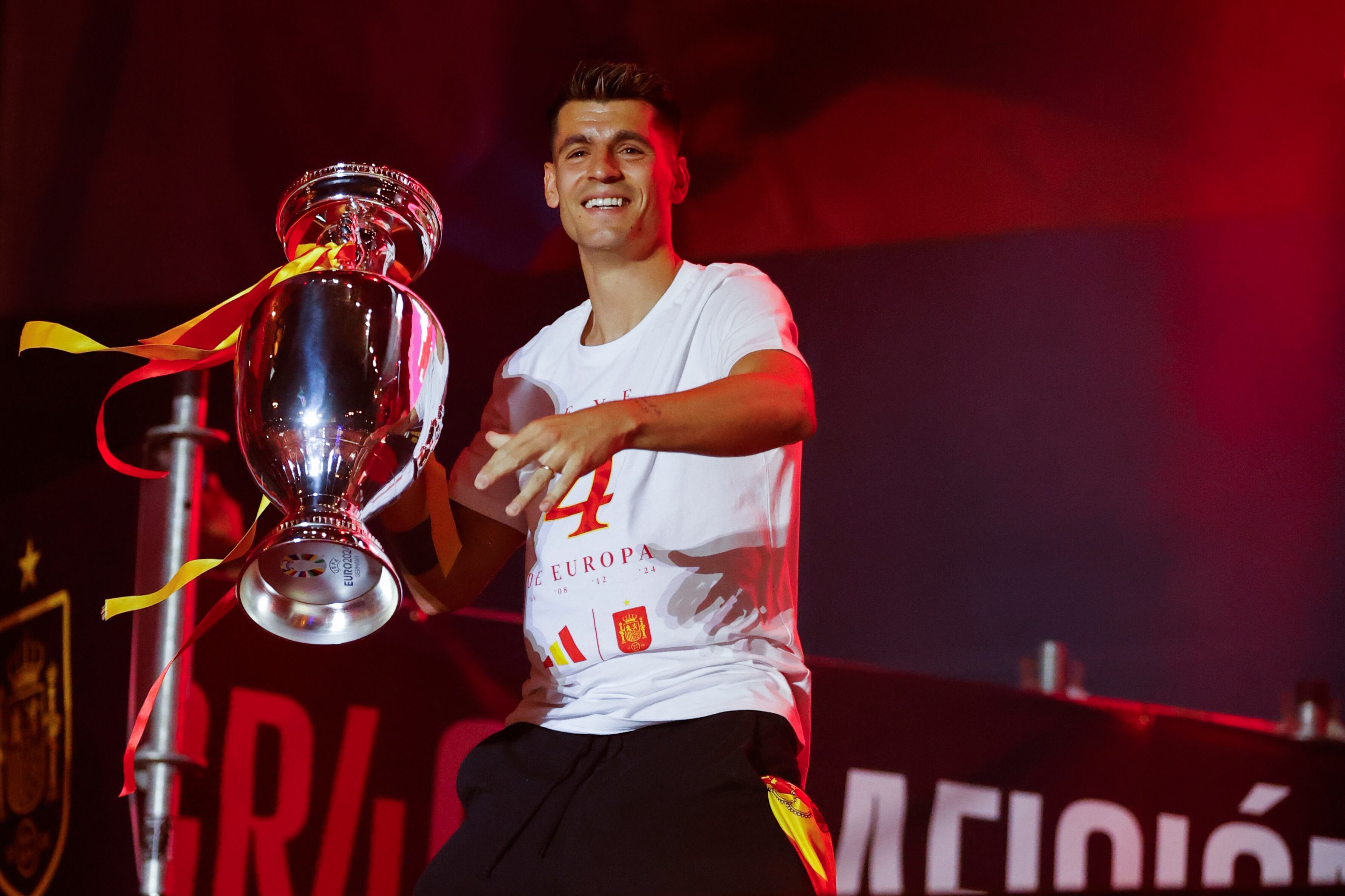 MADRID, 15/07/2024.- El jugador de la selección española, Álvaro Morata, durante la celebración este lunes en Cibeles del título de campeones de la Eurocopa conseguido tras vencer ayer en la final a Inglaterra disputada en el estadio Olímpico de Berlín. EFE / JP Gandul. / J P GANDUL