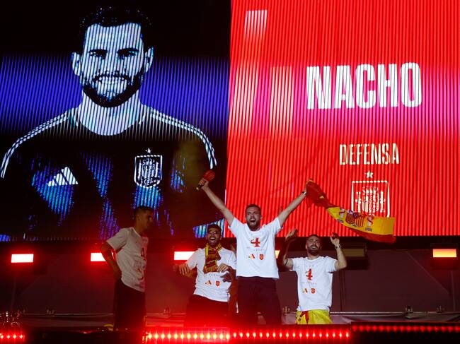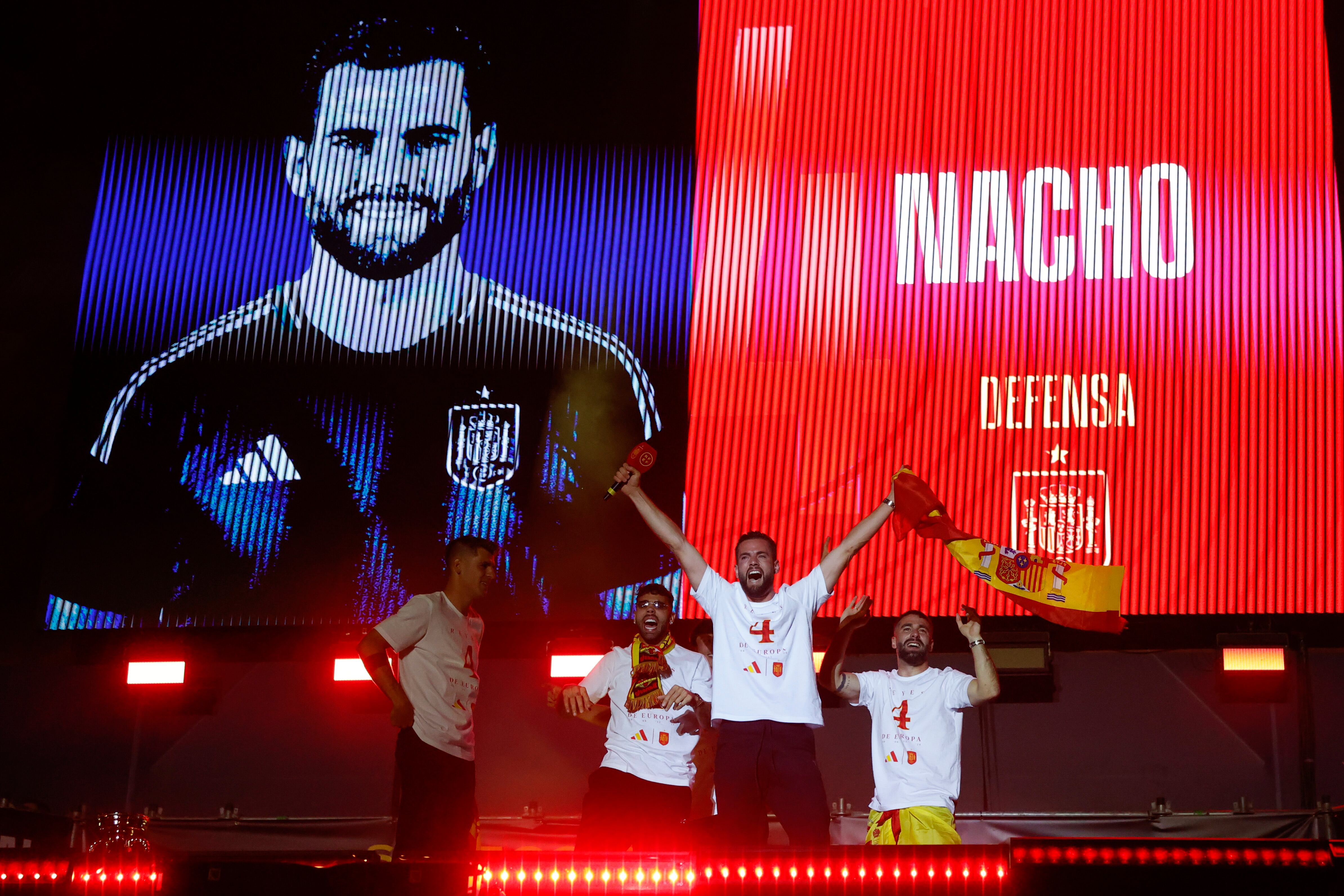 MADRID, 15/07/2024.- El jugador de la selección española, Nacho, durante la celebración este lunes en Cibeles del título de campeones de la Eurocopa conseguido tras vencer ayer en la final a Inglaterra disputada en el estadio Olímpico de Berlín. EFE / JP Gandul. / J P GANDUL