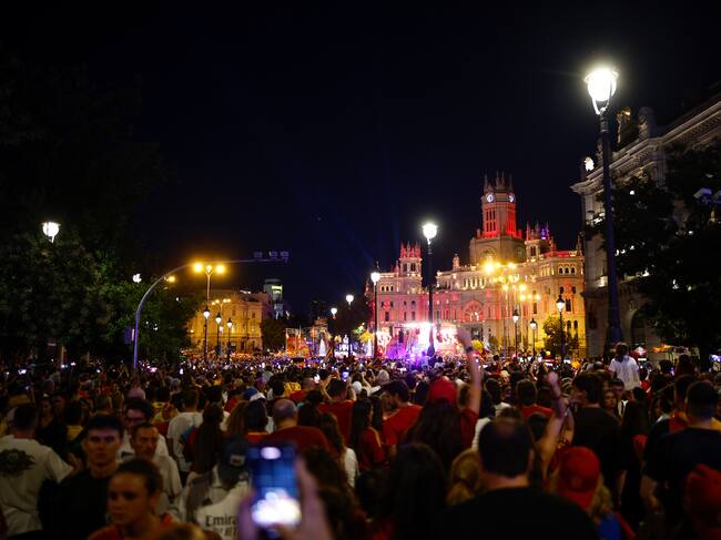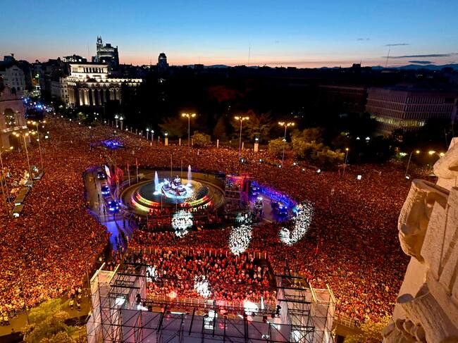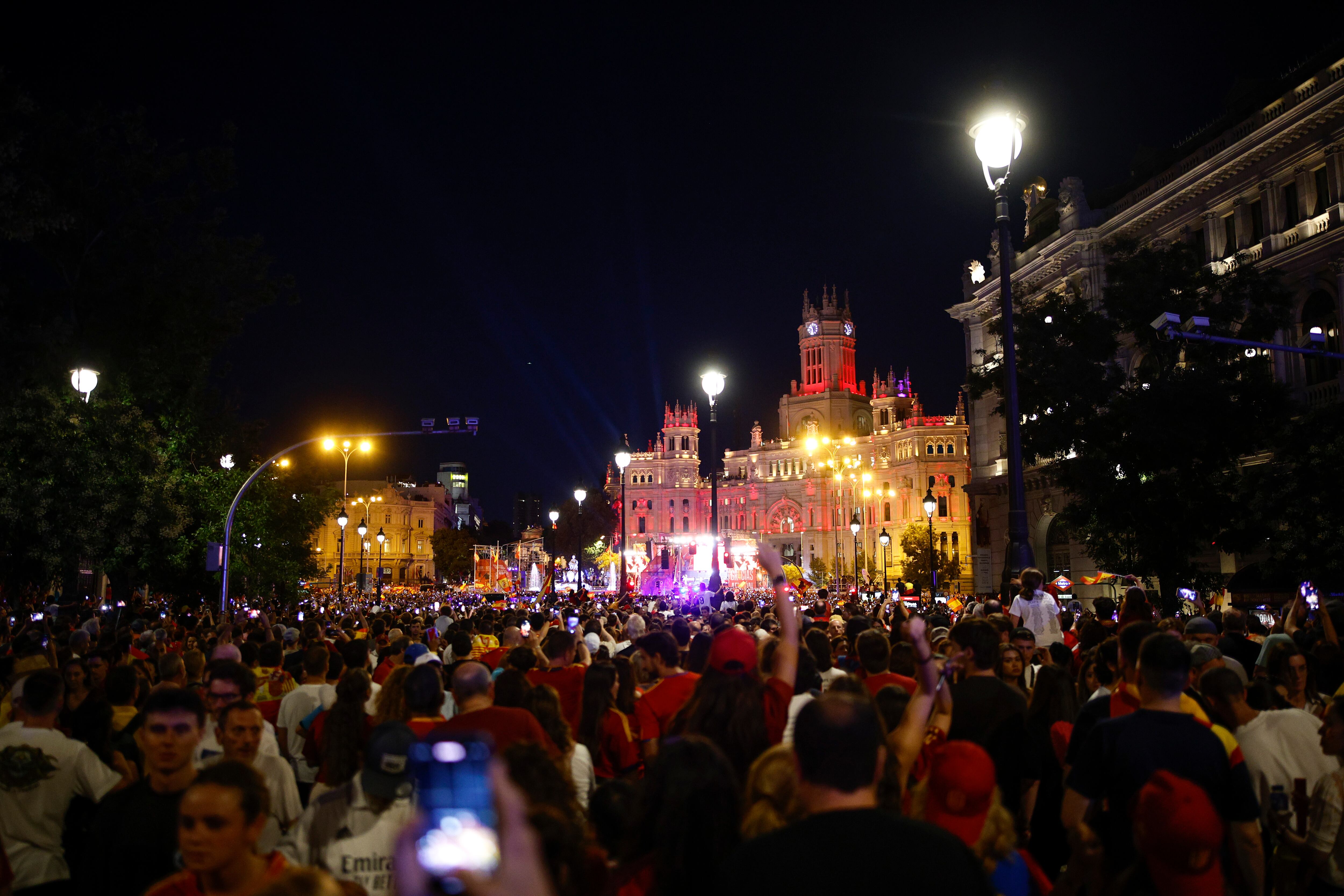 MADRID, 15/07/2024.- Miles de aficionados se concentran este lunes en Cibeles para celebrar con la selección española el título de campeones de la Eurocopa tras vencer ayer en la final a Inglaterra. EFE/ Fernando Villar / Rodrigo Jimenez