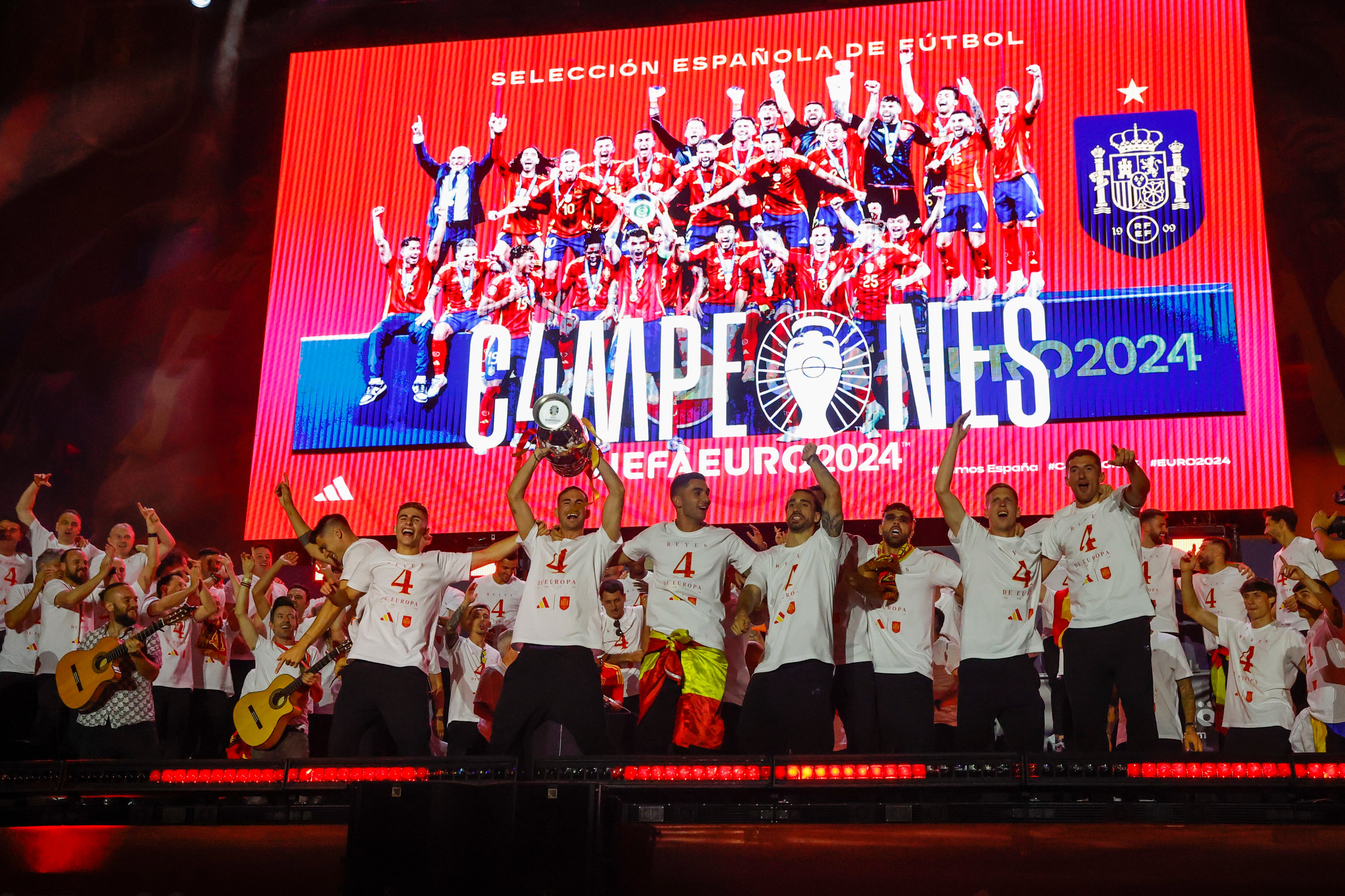MADRID, 15/07/2024.- Los jugadores de la selección española durante la celebración este lunes en Cibeles del título de campeones de la Eurocopa conseguido tras vencer ayer en la final a Inglaterra disputada en el estadio Olímpico de Berlín. EFE / JP Gandul. / J P GANDUL
