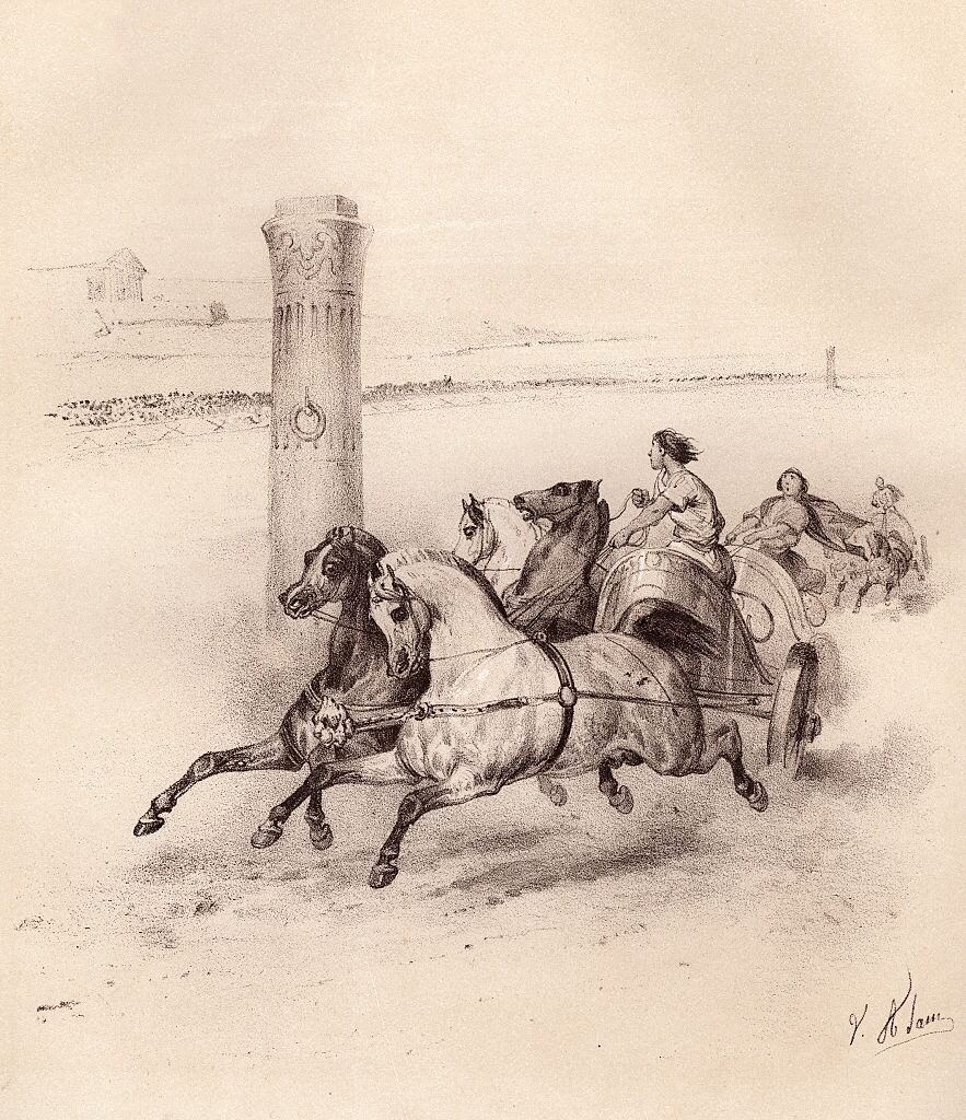Litografía que representa carreras de carros en los antiguos Juegos Olímpicos de Olimpia, Grecia. Foto: Getty Images. / adoc-photos