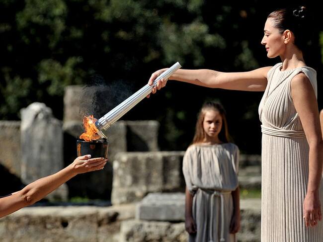 La actriz Maria Nafpliotou (derecha) interpreta el 21 de octubre de 2009 a una antigua suma sacerdotisa griega en la antigua Olimpia durante un ensayo general con la llama olímpica para los Juegos Olímpicos de Invierno de 2010. Foto: Getty Images. / ARIS MESSINIS