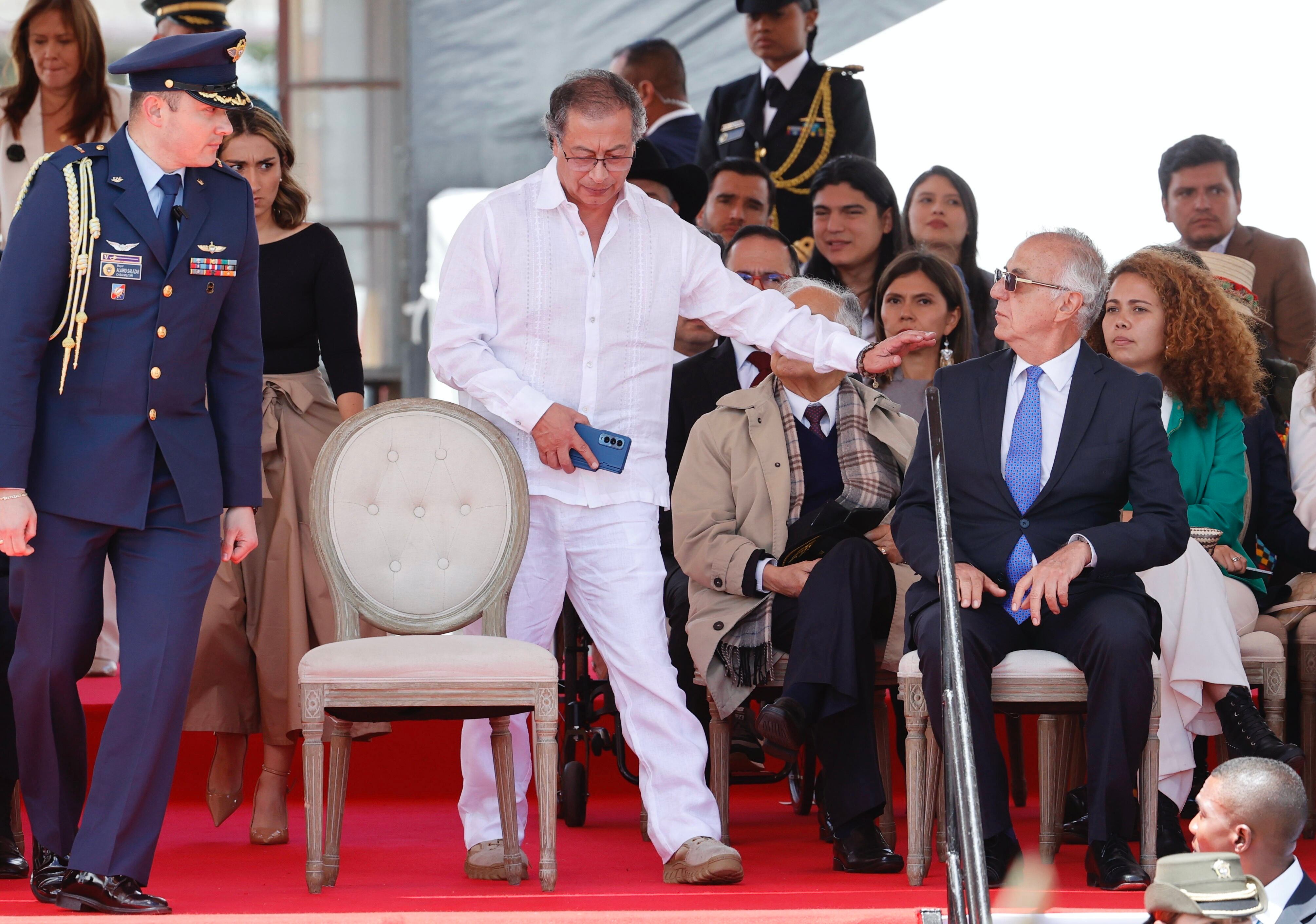 AME3409. BOGOTÁ (COLOMBIA), 20/07/2024.- El presidente de Colombia, Gustavo Petro (c), y el ministro de defensa, Iván Velásquez (d), asisten al desfile militar en conmemoración del Día de la Independencia, este sábado en Bogotá (Colombia). Este sábado 20 de Julio Colombia celebra su Día de la Independencia en un desfile militar con presencia de hombres y mujeres de las Fuerzas Militares y Policía Nacional. EFE/ Mauricio Dueñas Castañeda / Mauricio Dueñas Castañeda