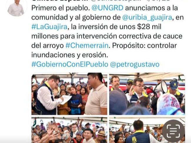 Es el caso del contrato de obra Nº 979 de 2023 anunciado el 1 de julio de 2023 por Olmedo López, este tenía como objetivo la “construcción de obras del cauce y obras para el control de inundaciones y erosión en el arroyo Chemerrain en el municipio de Uribia” este por un valor de 30.313 millones de pesos.