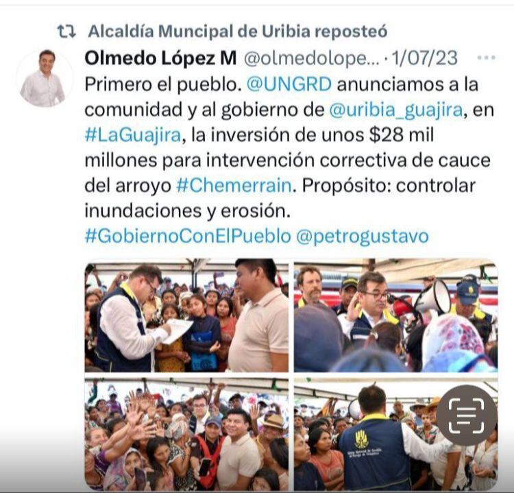 Es el caso del contrato de obra Nº 979 de 2023 anunciado el 1 de julio de 2023 por Olmedo López, este tenía como objetivo la “construcción de obras del cauce y obras para el control de inundaciones y erosión en el arroyo Chemerrain en el municipio de Uribia” este por un valor de 30.313 millones de pesos.