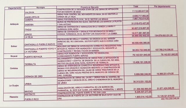 Se trata de 16 contratos que sumaron 402.754 millones, la mayoría tienen como objeto la realización de obras de mitigación para evitar la erosión de los ríos, Sigue La W revisó en detalle el cumplimiento de cada uno de los contratos y aunque no han iniciado, sí se han entregado anticipos del 20% del valor de los proyectos.
