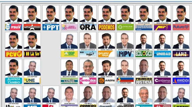 Mientras tanto, el candidato opositor de la coalición Plataforma Unitaria aparece tres veces, ya que el CNE solo autorizó a dos organizaciones políticas, más la tarjeta unitaria, poder postular.