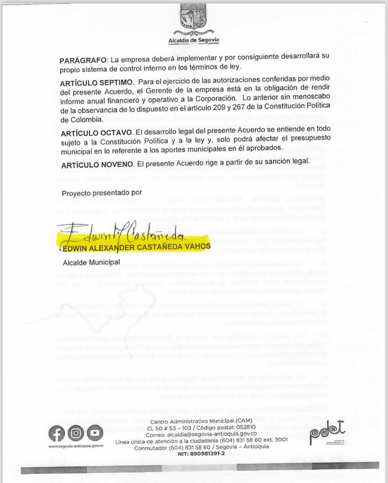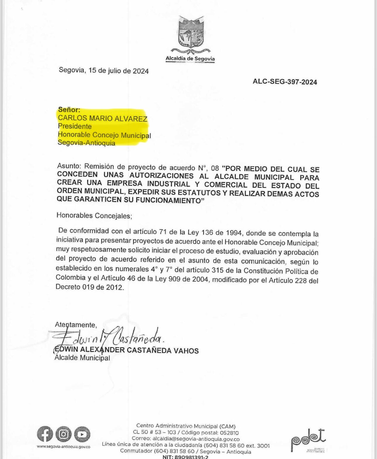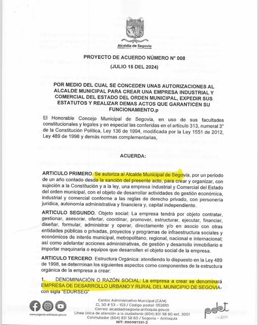 Sigue La W conoció que el cuestionado alcalde de Segovia, Antioquia, Edwin alexander Castañeda, alias ‘el Bombero’, presentó ante el Concejo un proyecto para crear su propio contratadero teniendo en cuenta que la Contraloría está investigando la empresa que antes utilizaban para entregar millonarios contratos a dedo.