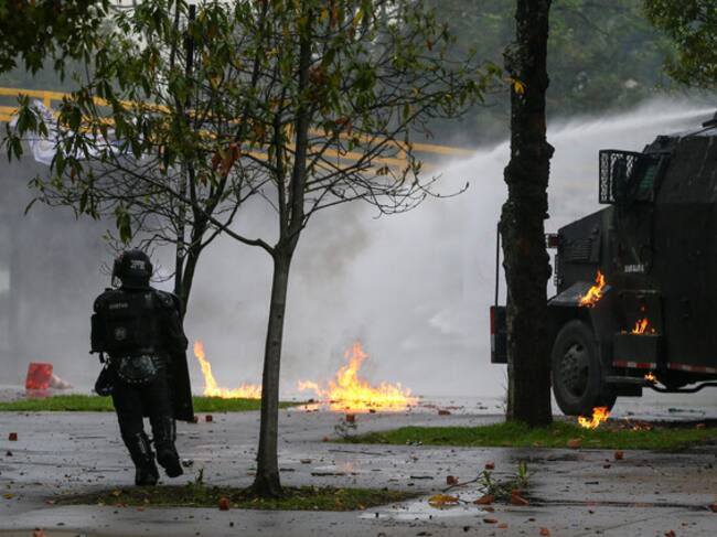 Encapuchados se enfrentan con la Policía mientras se intenta desbloquear la calle 26 de Bogotá.