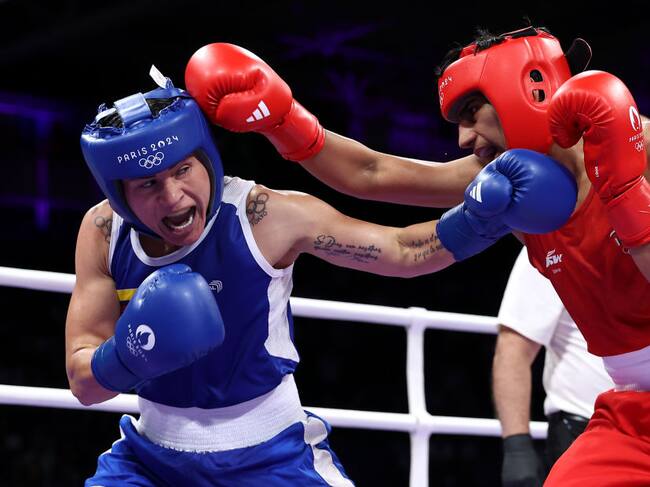 PARIS, FRANCE - JULY 30: Yeni Marcela Arias Castaneda of Team Colombia and Preeti of Team India exchange punches during the Women's 54kg preliminary round match between Preeti of Team India and Yeni Marcela Arias Castaneda of Team Colombia on day four of the Olympic Games Paris 2024 at North Paris Arena on July 30, 2024 in Paris, France. (Photo by Richard Pelham/Getty Images) / Richard Pelham