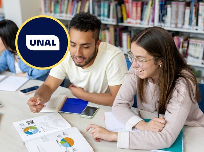 Universitarios estudiando en una biblioteca, junto al logo de la Universidad Nacional (GettyImages / redes sociales)
