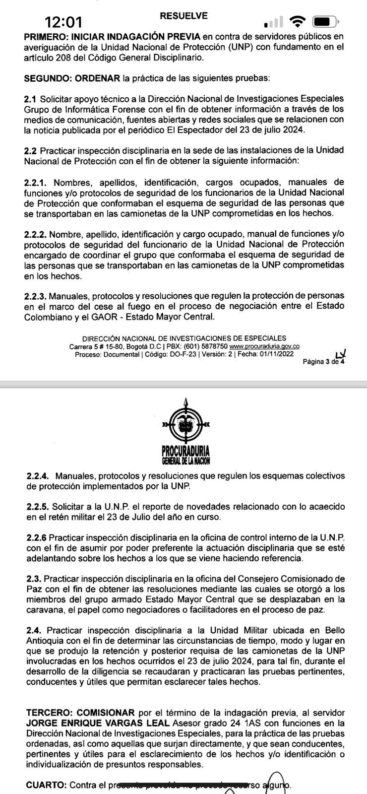 Y otra inspección disciplinaria que ordenó el Ministerio Público es a la Unidad Militar ubicada en Bello Antioquia con el fin de determinar las circunstancias de tiempo, modo y lugar en que se produjo la retención y requisa de las camionetas de la UNP involucradas en los hechos ocurridos el 23 de julio 2024.