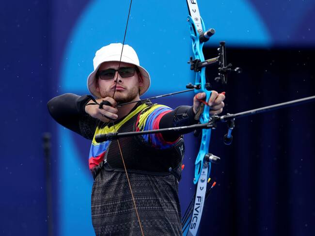 PARIS, FRANCE - AUGUST 01: Santiago Arcila of Team Colombia competes during the Archery Men's Individual 1/32 contest against Pit Klein of Team Luxembourg on day six of the Olympic Games Paris 2024 at Esplanade Des Invalides on August 01, 2024 in Paris, France. (Photo by Julian Finney/Getty Images) / Julian Finney