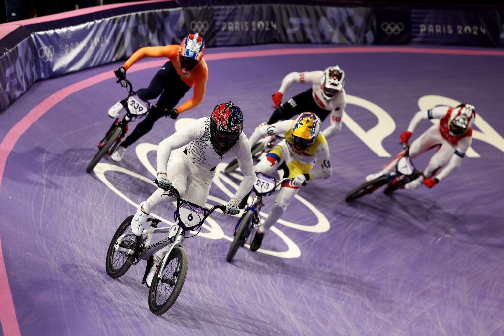 PARIS, FRANCE - AUGUST 01: Jaymio Brink of Team Netherlands, Rico Bearman of Team New Zealand, Carlos Alberto Ramirez Yepes of Team Colombia compete during the Men's Last Chance Race on day six of the Olympic Games Paris 2024 at Saint-Quentin-en-Yvelines BMX Stadium on August 01, 2024 in Paris, France. (Photo by Alex Broadway/Getty Images) / Alex Broadway